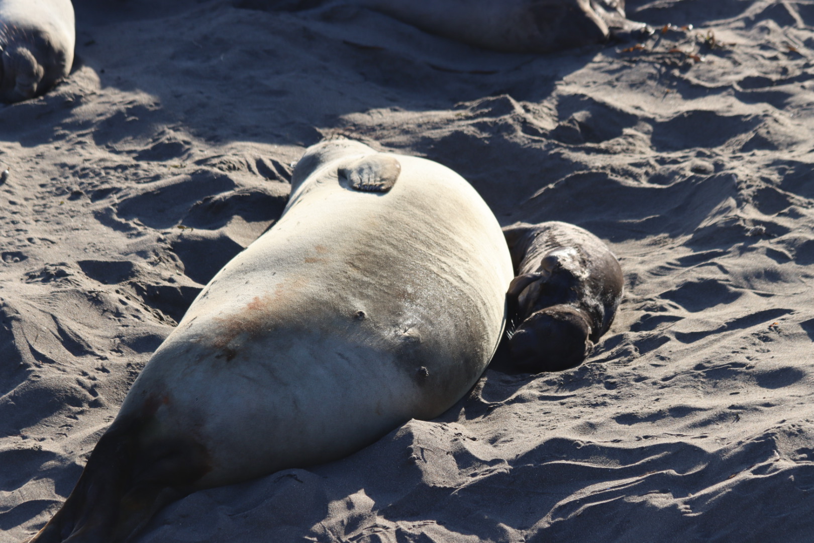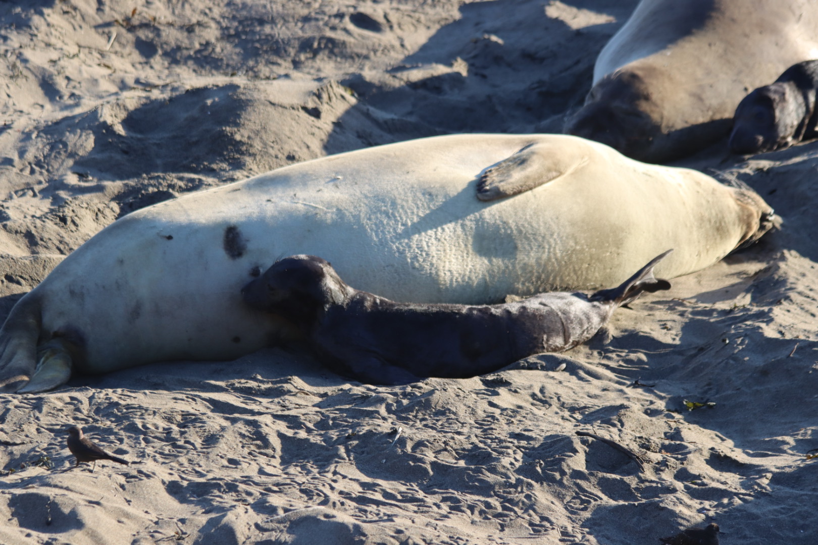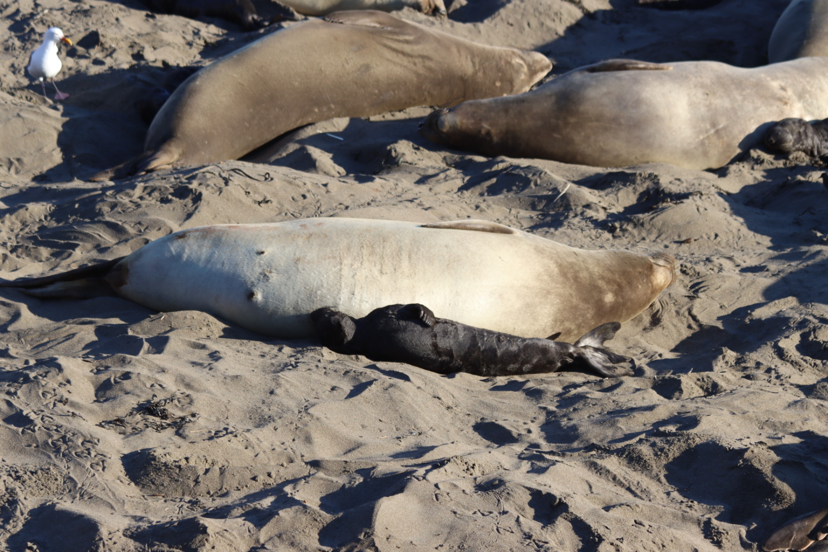 2. Me either! We were here last in May and many have left by then and juveniles are left alone there until they venture out to sea. I’ve been in the fall when they start to”haul out ” after their summer feeding, and I’ve been one time when I’ve seen bulls sparing for beach turf, must have been December. I’d love to have walked along farther on the great new boardwalk to see I can see any birthing. There were a few so wet from birth and many sea gulls patrolling, they do clean up of the beach, eating the remnants of placenta lying around. An amazing time to be here for sure.