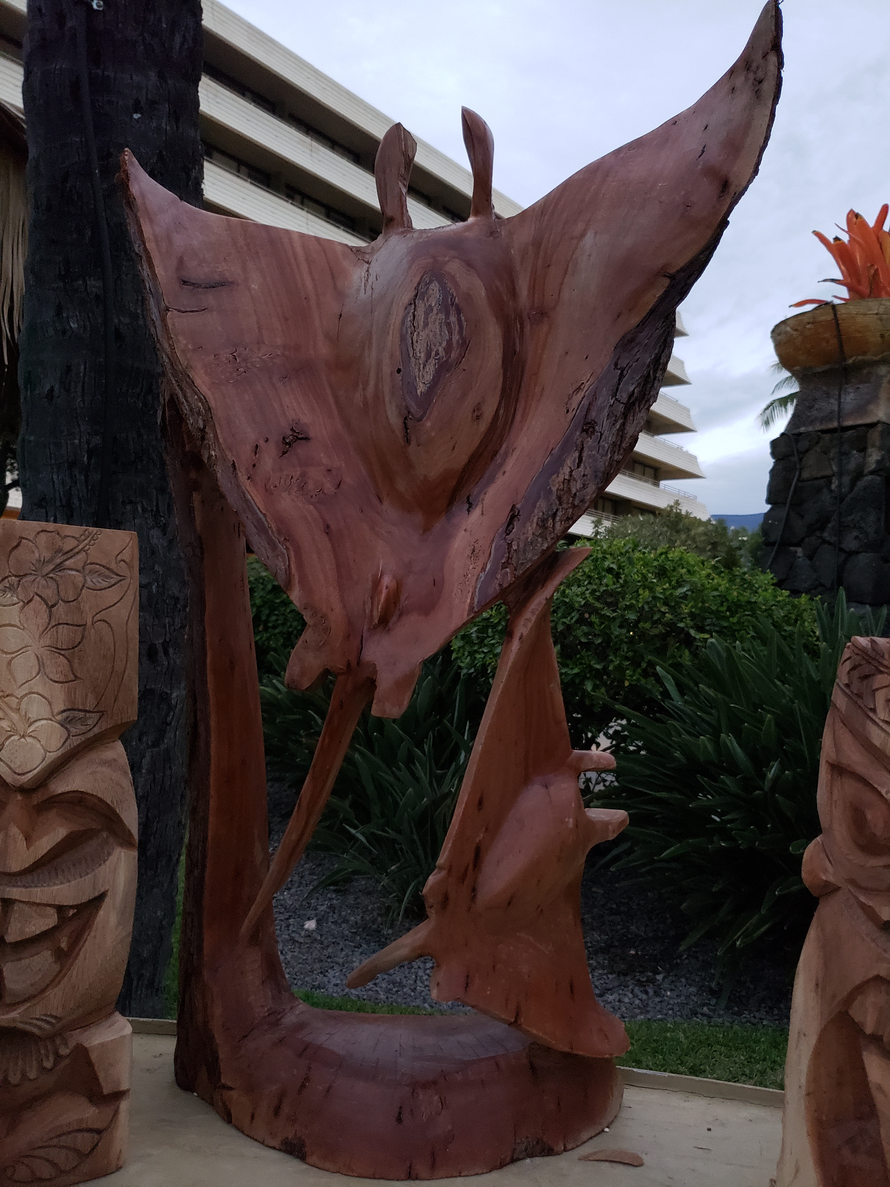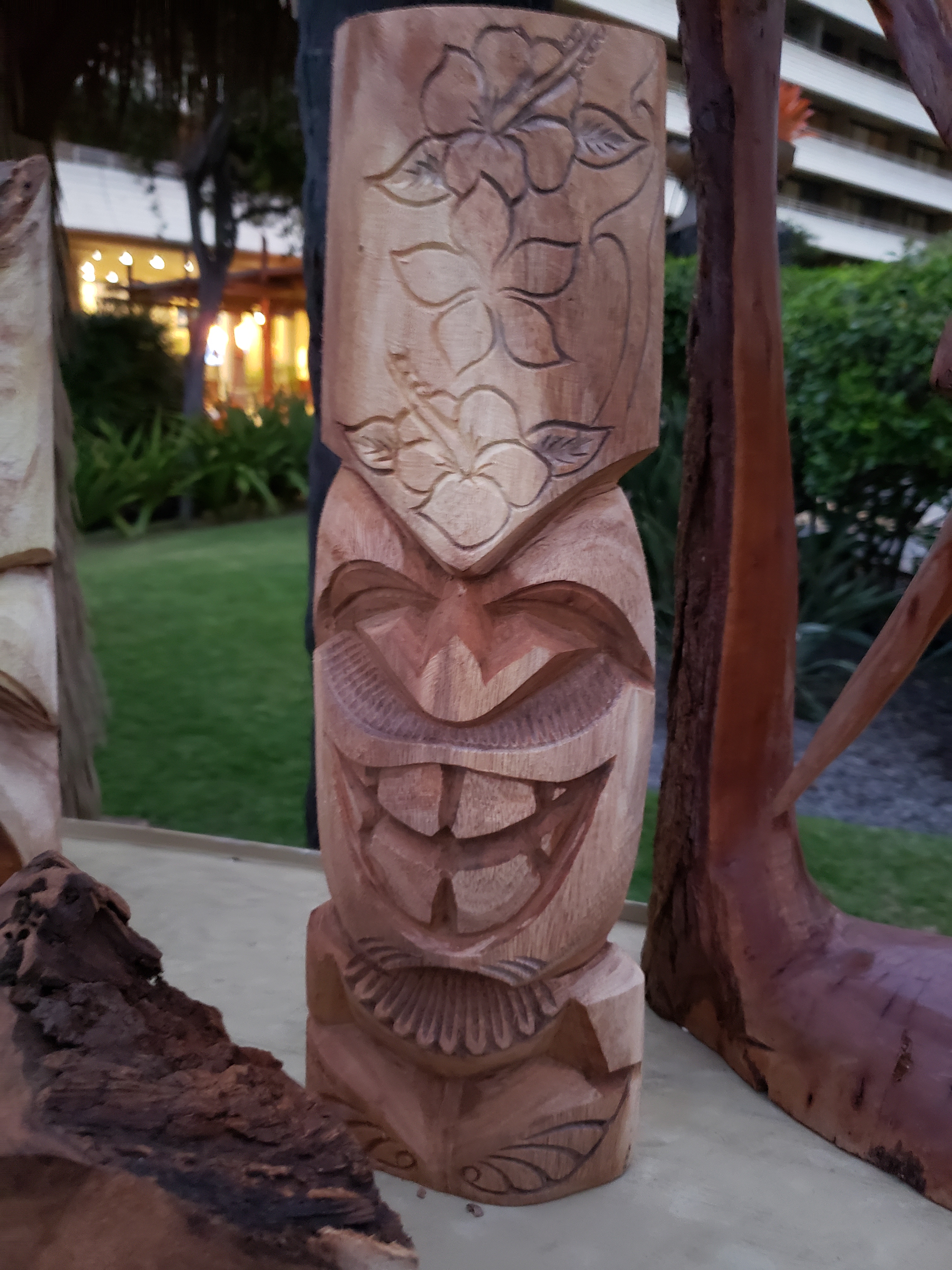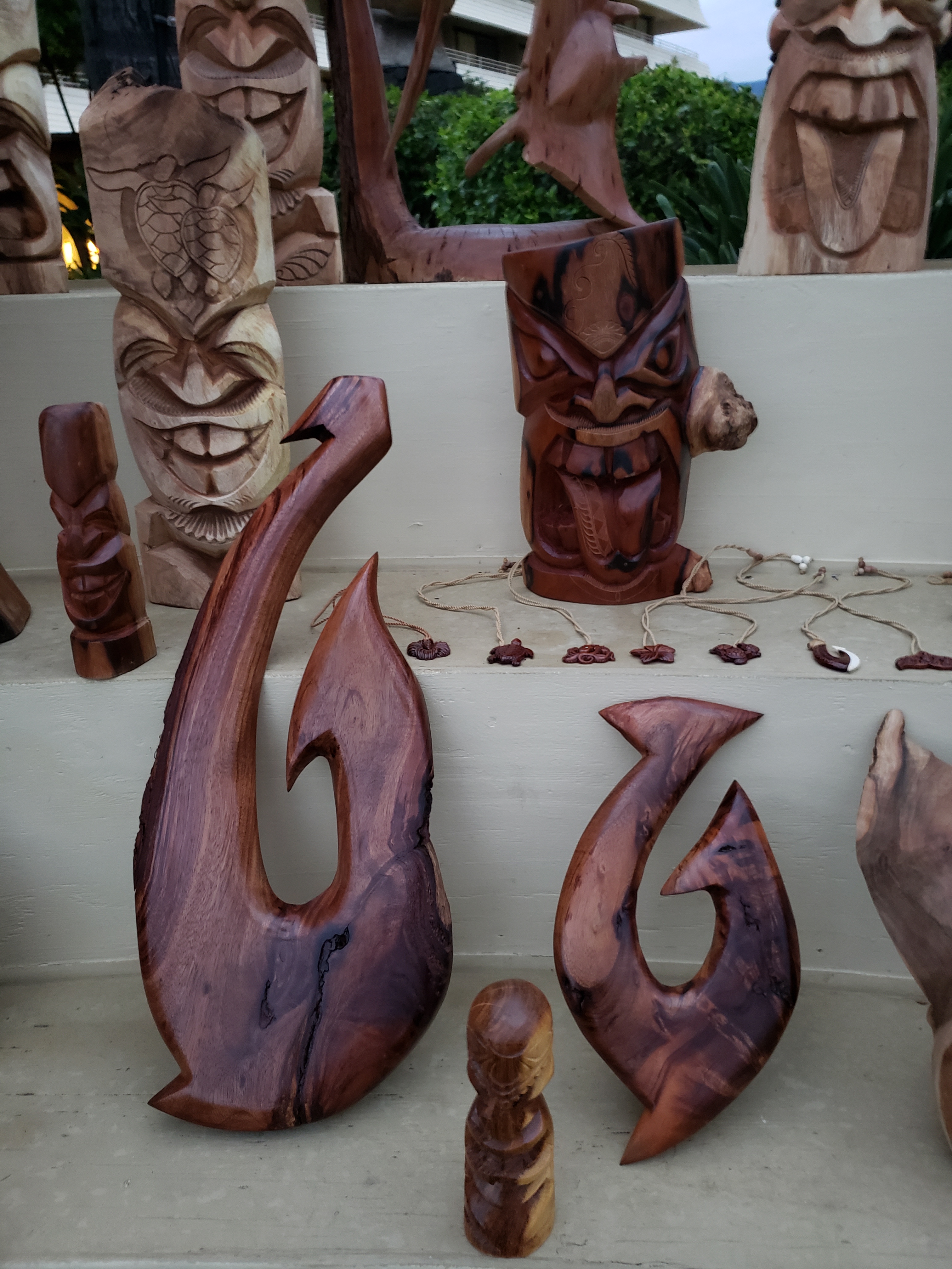 There is a wood carver here at the hotel named ‘Auhi’a whose family has carved Tikis, Turtles, necklace, and other souvenirs. His family carved and gave the giant Tiki to the Royal Kona that greets you as you enter the drive. The lockout devastated his family business, as it has many family restaurants and businesses all over the islands. I loved this fish hook and Auhi’a personalized it with the honu, the sea turtle, his name and the year on the back. The wood is curly koa. I will add some more pictures later of other objects he has carved. it will be a wonderful addition to our carved hawaiian wood articles at home.
