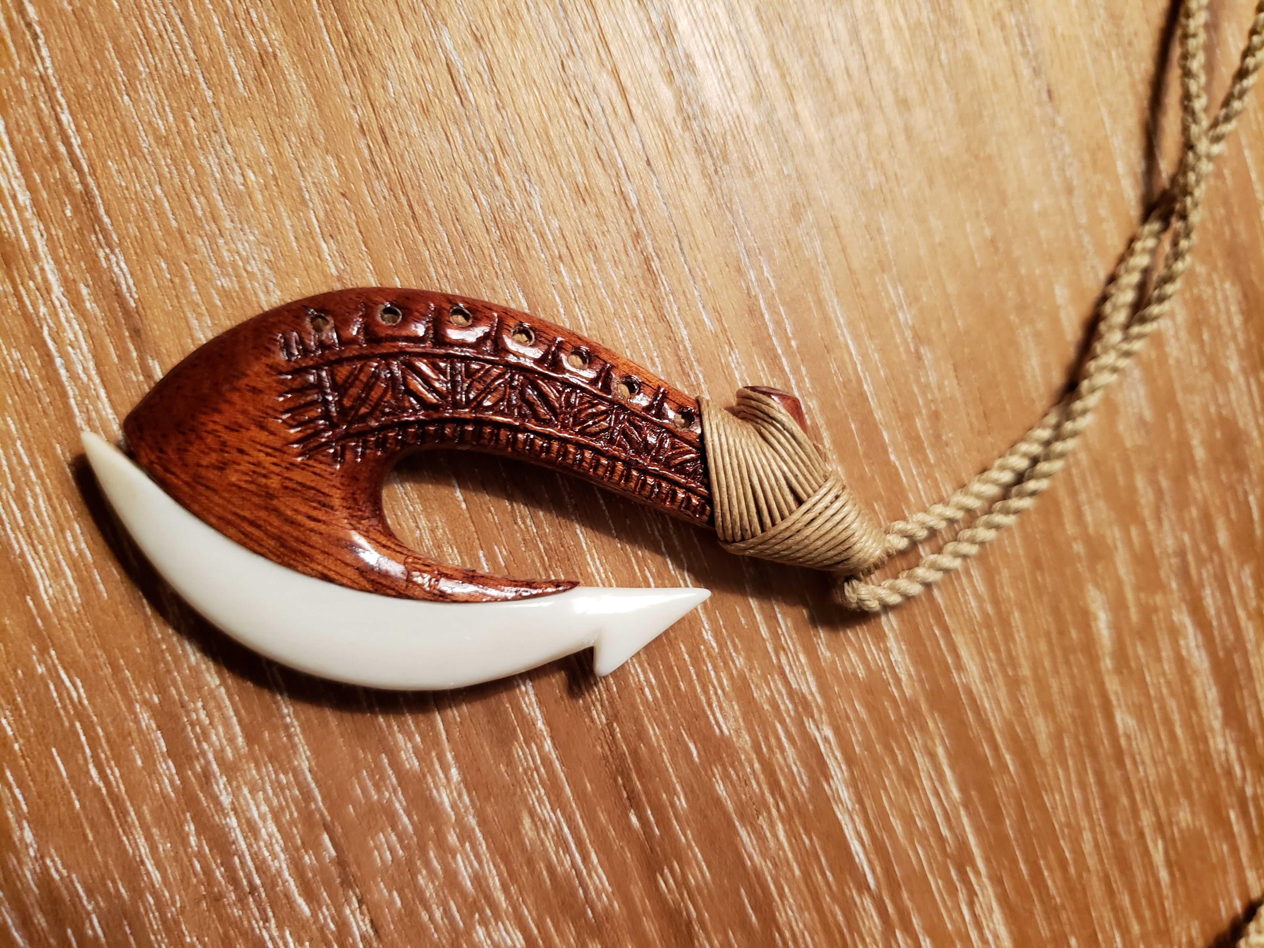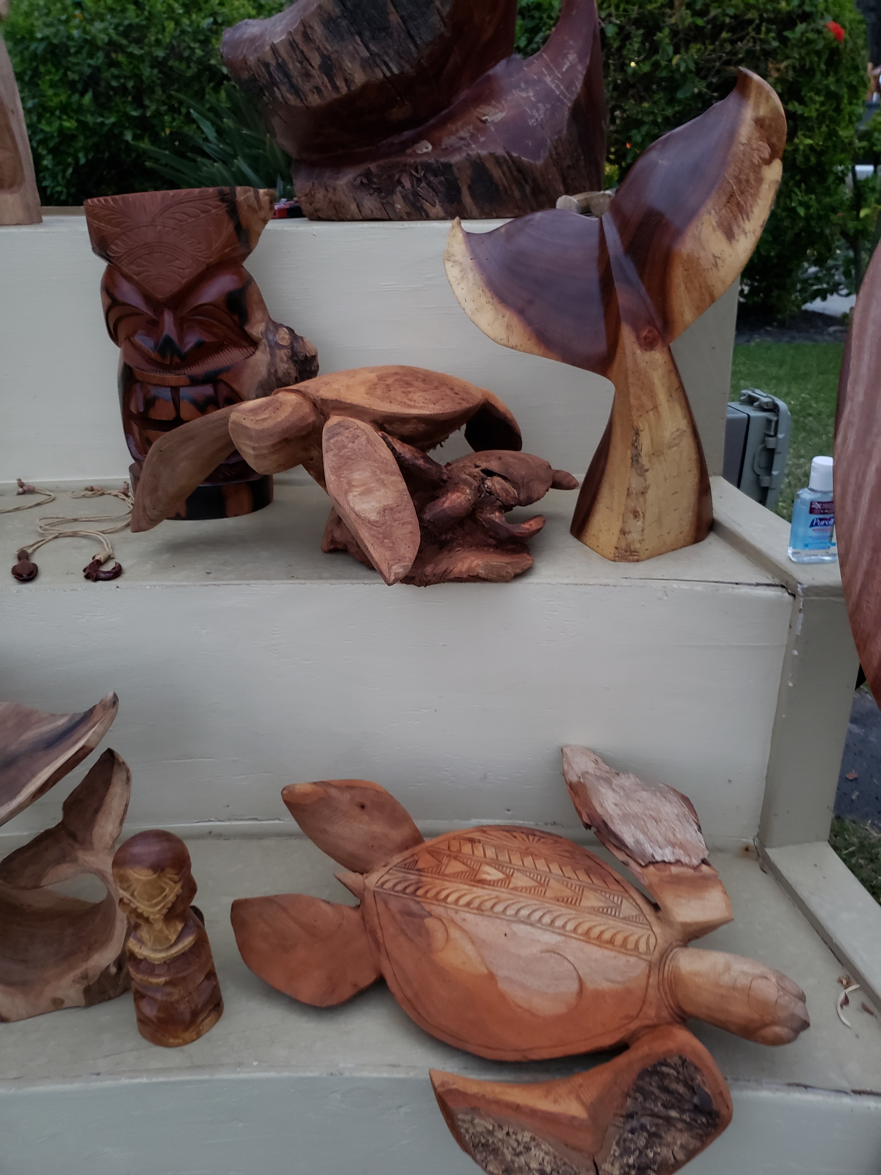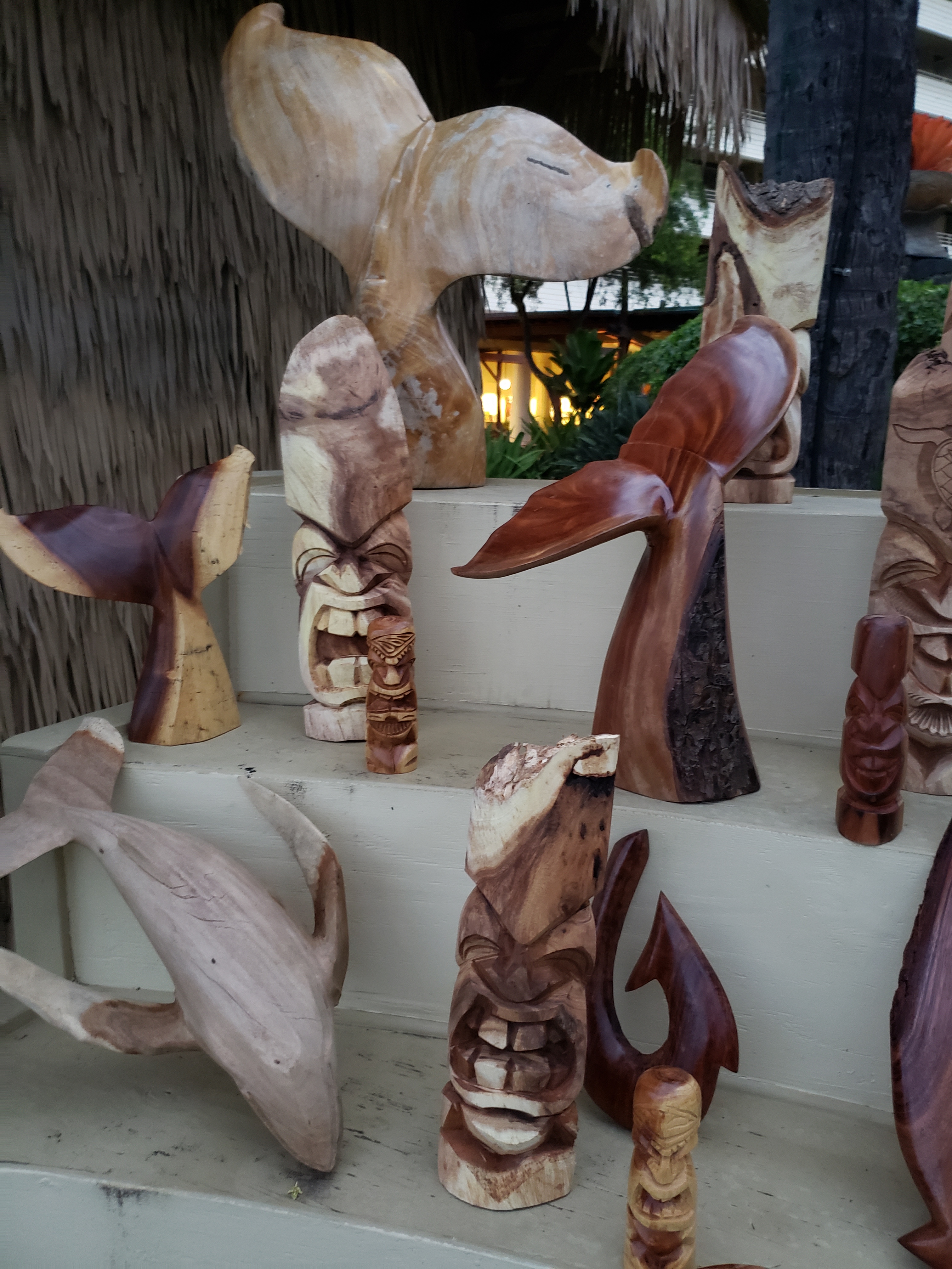 There is a wood carver here at the hotel named ‘Auhi’a whose family has carved Tikis, Turtles, necklace, and other souvenirs. His family carved and gave the giant Tiki to the Royal Kona that greets you as you enter the drive. The lockout devastated his family business, as it has many family restaurants and businesses all over the islands. I loved this fish hook and Auhi’a personalized it with the honu, the sea turtle, his name and the year on the back. The wood is curly koa. I will add some more pictures later of other objects he has carved. it will be a wonderful addition to our carved hawaiian wood articles at home.