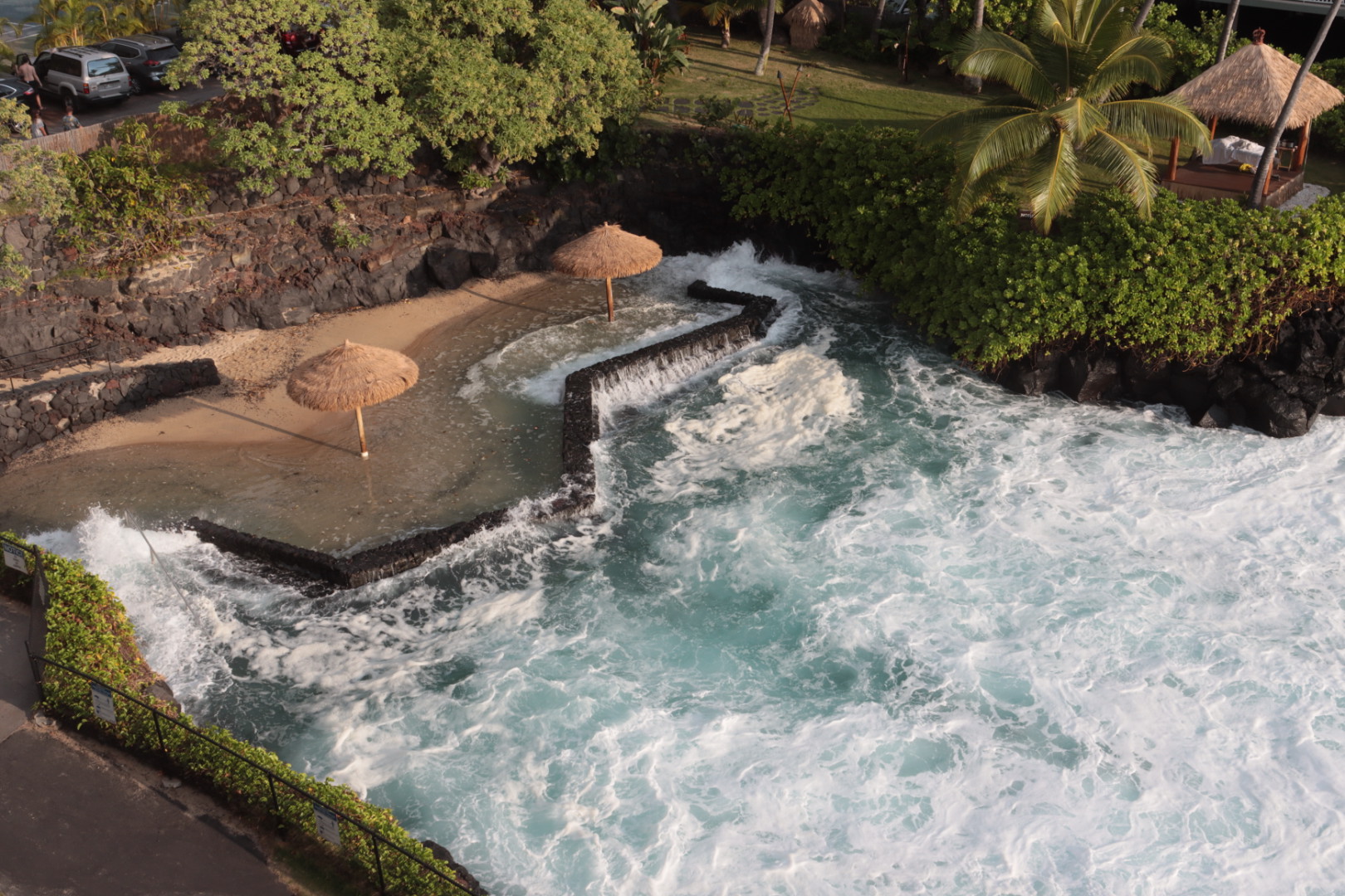 Our little Lagoon has had some battering with large swells over a few days. At times the waves broke Ober the natural volcanic barrier and up into the sand