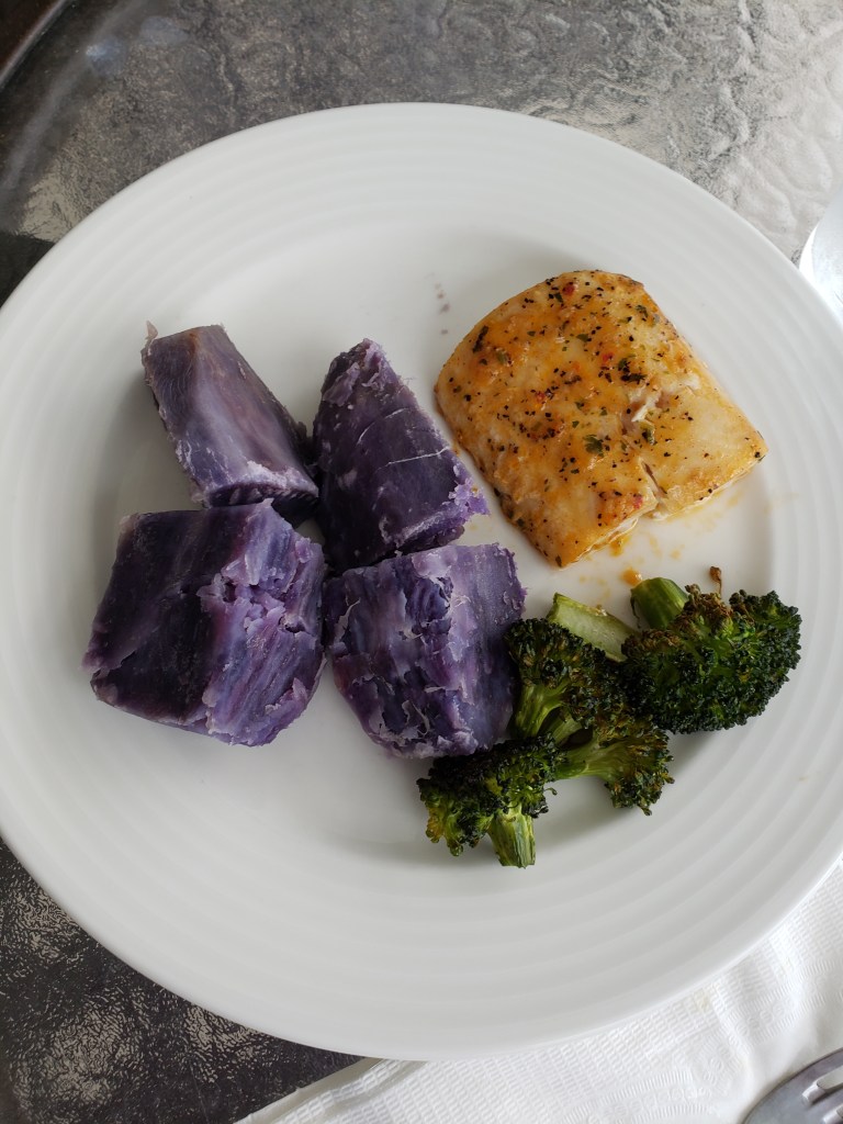 We Are very happy to be able to make our own dinners again, since our new timeshare is an awesome 2 BR condo! Tonight Emmett made Mahi mahi, broccoli with Molokai purple sweet potatoes! It was delish!