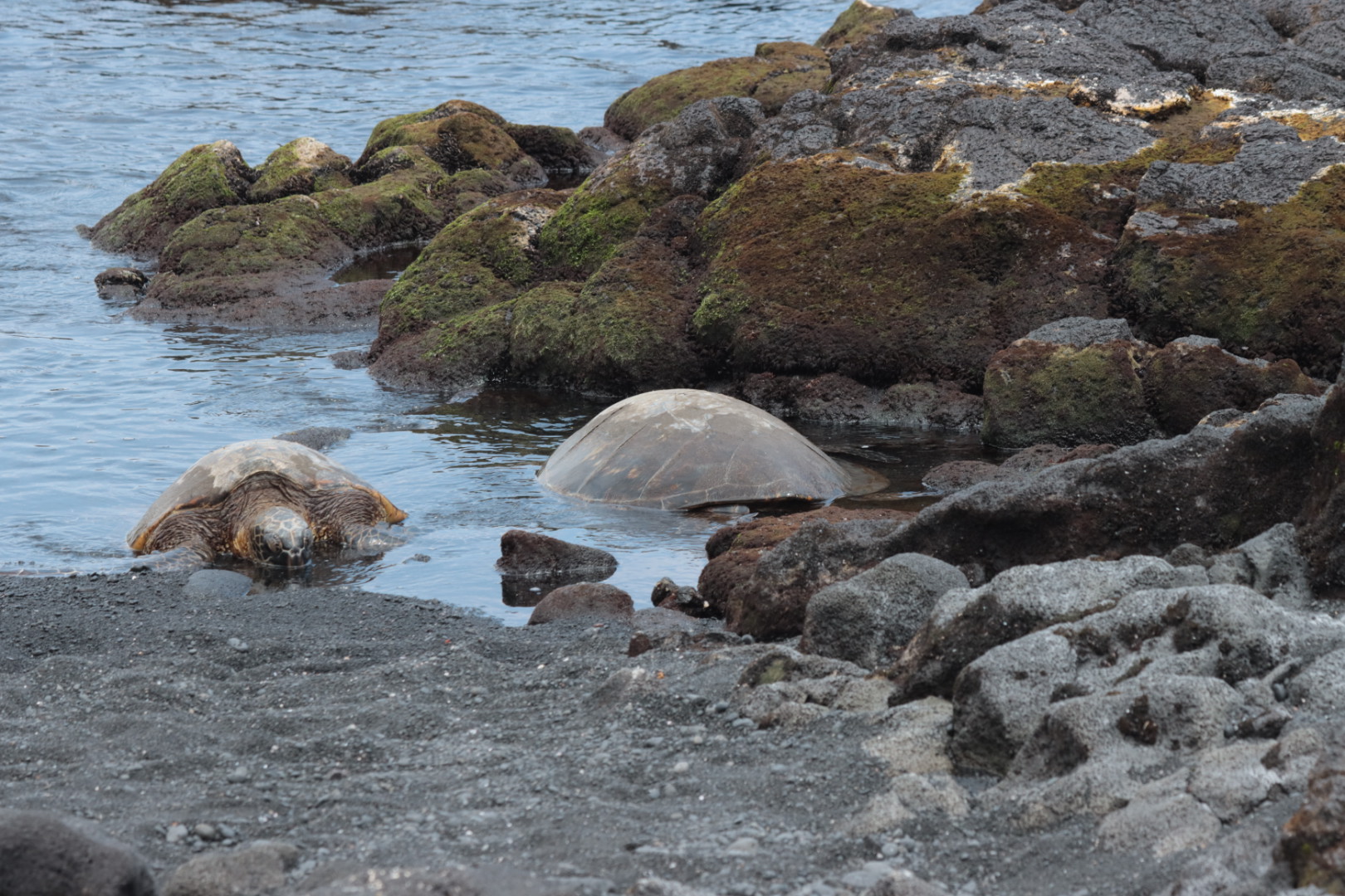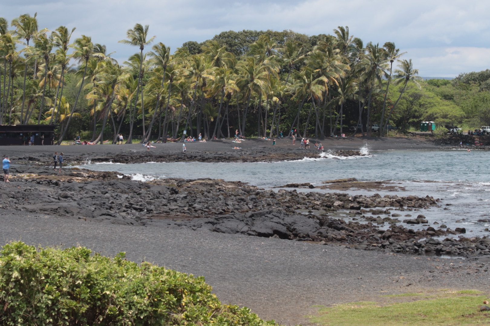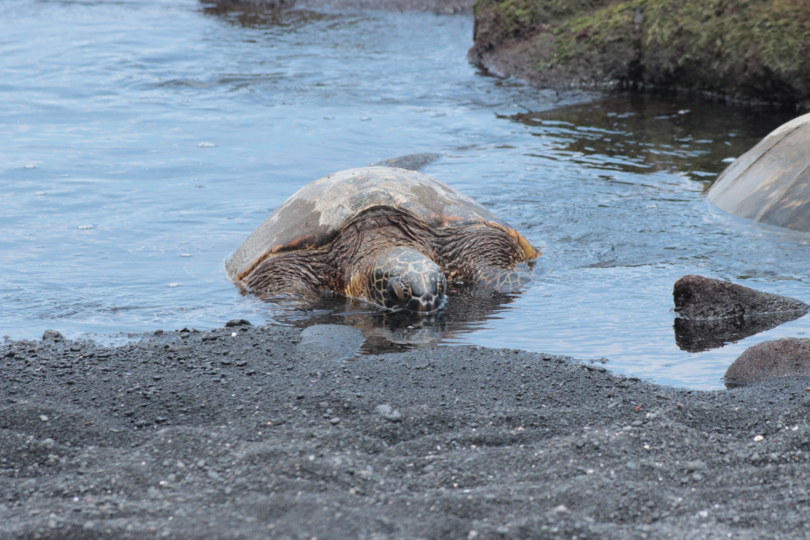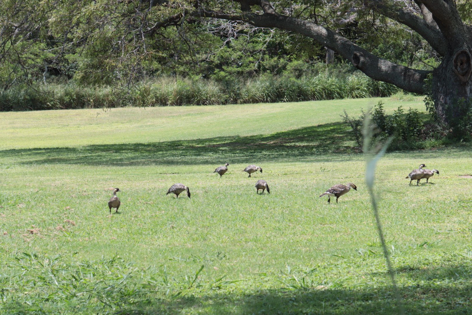 We decided to stay near Volcano, HI one night so we could take in more of the park and the devastation of the 2018 eruption in Leilani Estates. Our drive down the island of course had to include a stop at the Punalu’u Bakery and the black sand beach. Sorry, we gobbled down the malasadas before we could take a picture! They made a great dessert for our picnic lunch at the beach. Near Sea Mountain Resort, at the golf course, we saw a flock of Nene, Hawaii ‘s state bird.
