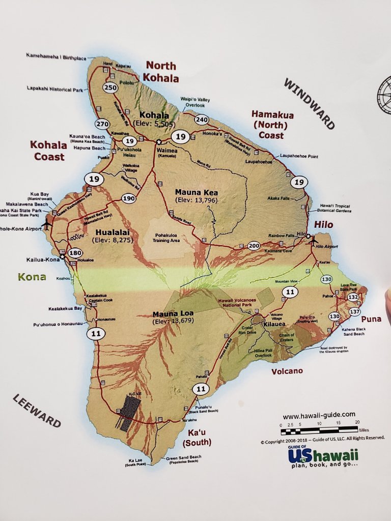 I just realized, we have talked a lot about the areas of the Big Island. This map may help you get the big picture. Excuse the strip across, just a printer error. But it does highlight where Kona is, right on the left end of it. The volcano right behind our resort is Hualalai It’s a 2.5 hr drive down to Volcanos National Park or over to Hilo