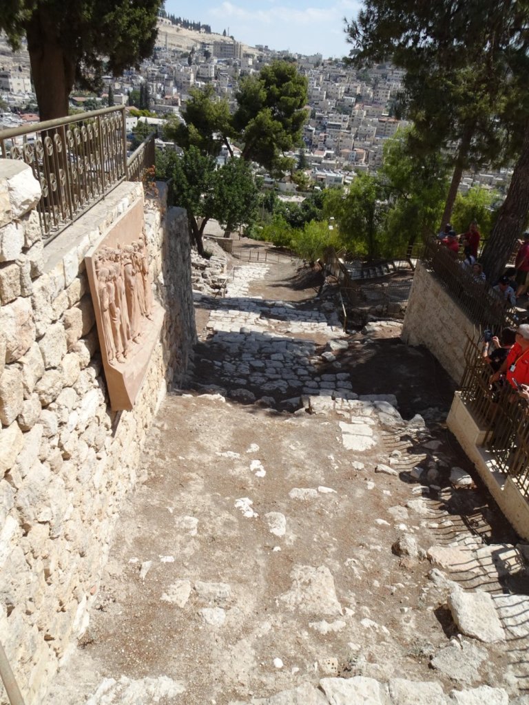 We then traveled to Mount Zion, across the Kidron Valley, along the way Jesus was taken by the soldiers, for trial at the home of the High Priest, Caiaphas. This is the place that Peter denied Christ 3 times before the cock crowed. St Peter in Gallicantu chapel, a modern Chapel is built over the ruins of what may be the high priest’s home. There is a pit there, possible the pit where Jesus was placed for some hours the night of His arrest. We sang there and read a scripture. There is a first century stairway there, certainly traveled by Jesus between Kidron Valley and Moint Zion.