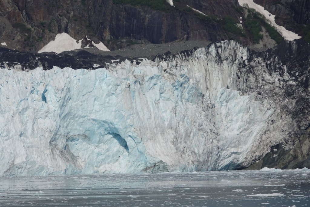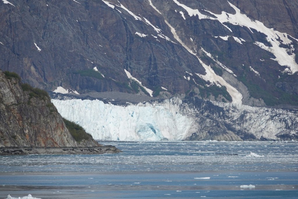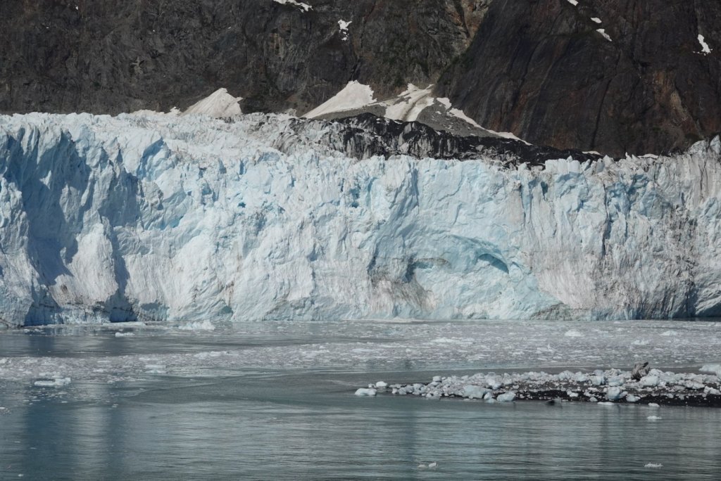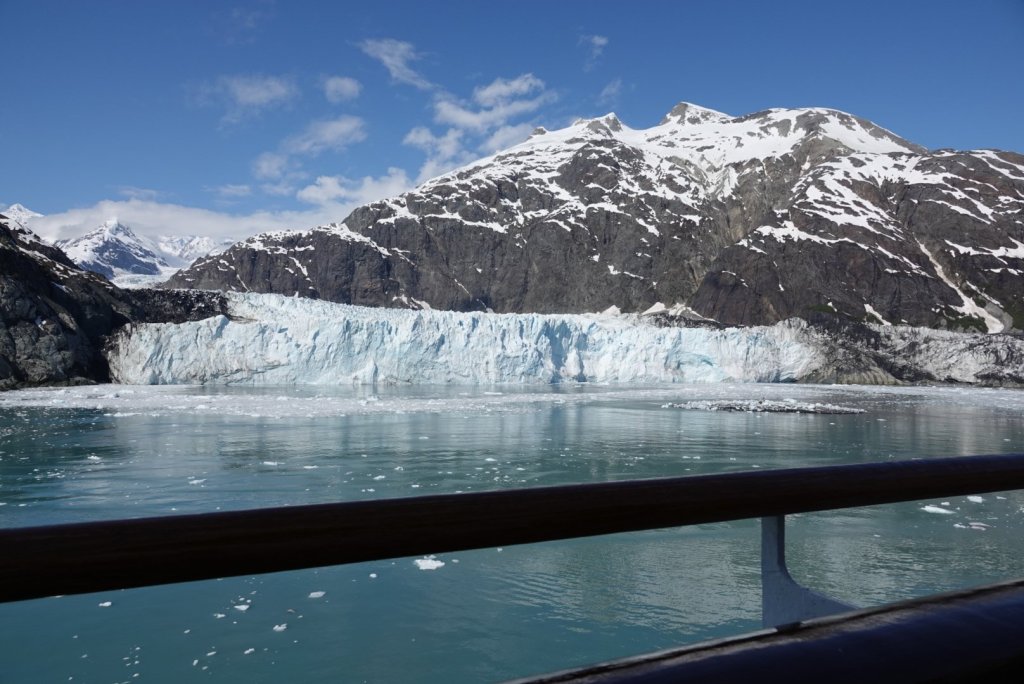 We were the most fortunate today!  The Marjorie glacier has had a spectacular show,  calving for us several times,  great chucks of glacier falling into the bay with huge splashes and waves.   The skies are brilliant blue and the rugged peaks over the glacier, occasionally sporting puffy clouds,  stand out against the blue.