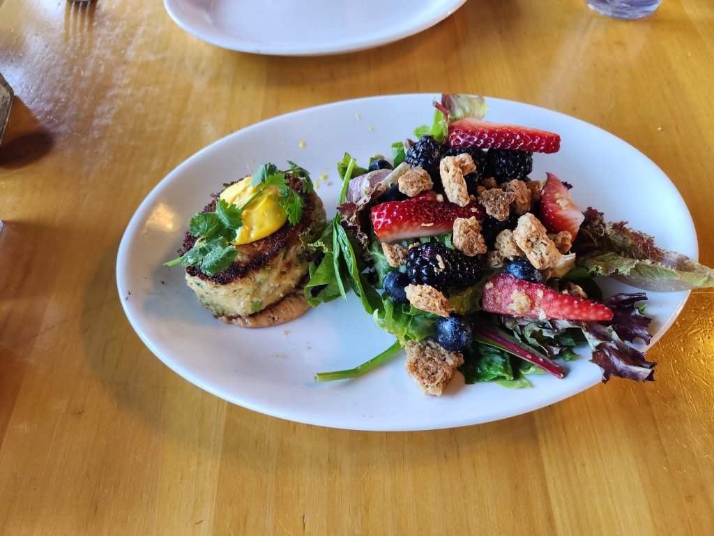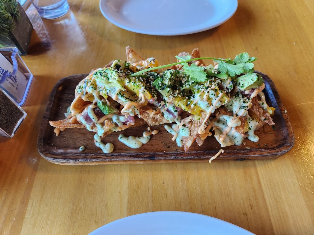 Creekside Bistro shared dishes, Ahi Nachos, Crab cake, lamb lollipops, and peach cobbler!