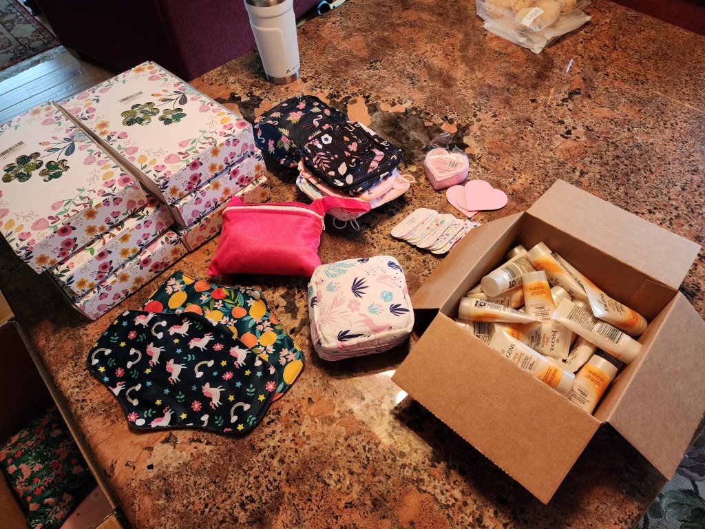 (This made 36 kits with 3 pads, a sponge, a nail file, and a lotion for the teenage girls and ladies)