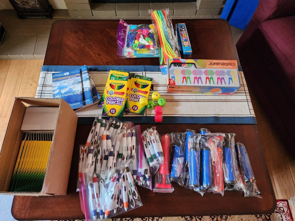 Along the way, when we visit villages, we want to bring a few gifts. This week, our fellow travel mate, Cheryl Thoreen and I have packed 2 large duffle bags with fun things for kids and some gifts for adults, too.