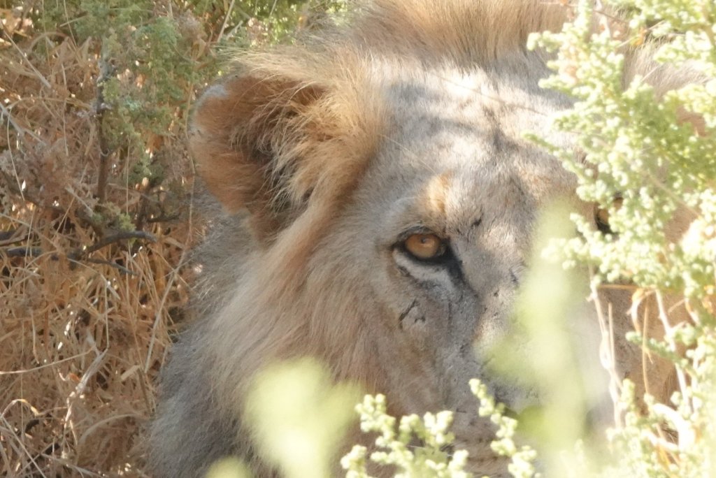 When we arrived at the area the 2 male lions had been sighted, there were already 4-5 vehicles vying for a good position. But the lions were resting in deep brush, nestled among the plants. Lying low! We were able to see them move when both of them tried to make a quick get away altho we couldn’t photograph them running. We found a great position to see the head of the lighter color one…. and caught a photo of him eying us!