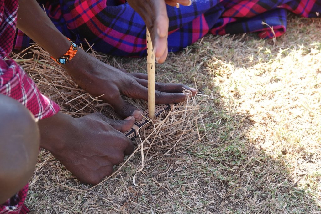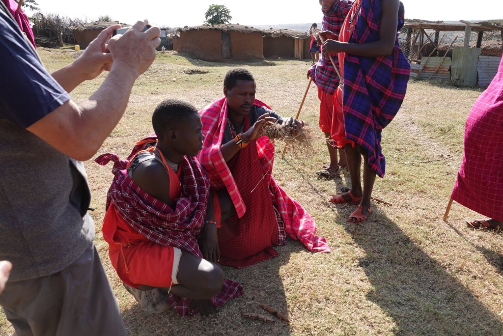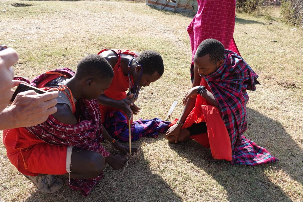 The Men demonstrated lighting a fire with 2 pieces of wood, 1 hard and 1 soft, and a bundle of dried grass.