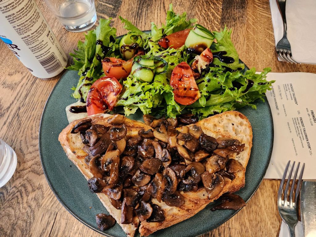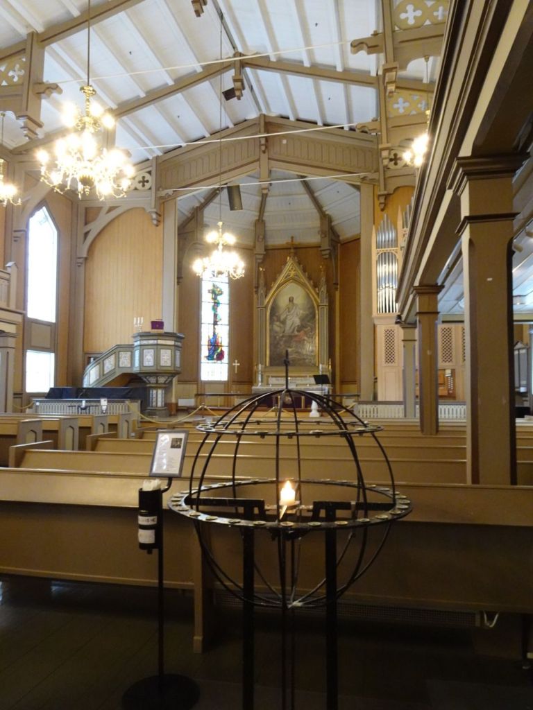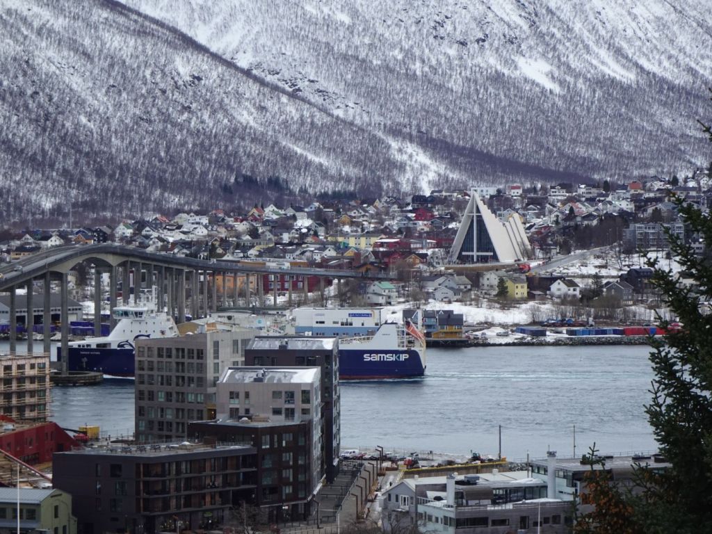 Our second day in Tromso we had a tour of the whole island, 10k x 4k, with 45k inhabitants, and a short drive on Whale Island, a bigger island between Tromso and the sea, where there is a herd of reindeer walking among the houses! Every reindeer belongs legally to the Sami people, even those walking free. We visited the planetarium for a wonderful northern lights movie, then a drive around the Arctic cathedral on the mainland side of the fjord, however no visit inside since there was a funeral there today. After our tour, we chose a delicatessen for a wonderful lunch of goat cheese panini with sautéed mushrooms on top with a delicious salad, and then a bakery for a Pastry of cranberries and cheese