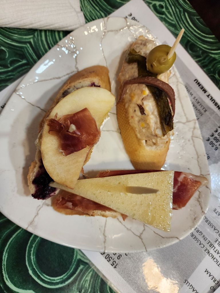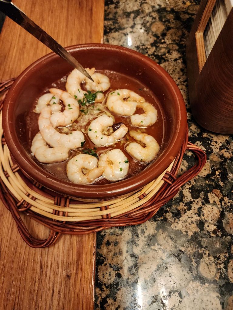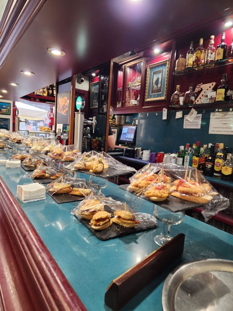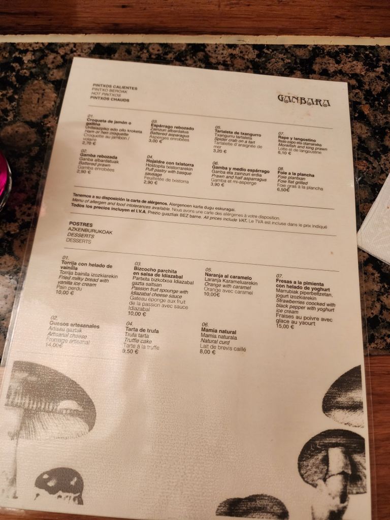 Our first dinner in San Sebastián has to be of course a Michelin mention at least! And pintxos, of course! The guys are in charge of picking out dining and they are doing a fantastic job! This is last night, in the old town, at Ganbara. 13 food items between the 4 of us, wild mushrooms, crab tarts, gambas (shrimp in garlic olive oil) wonderful battered asparagus and shrimp…. it was all delicious! As much as we could eat, we were all full! With drinks, just 123€