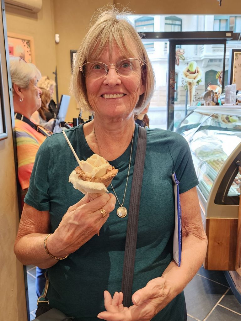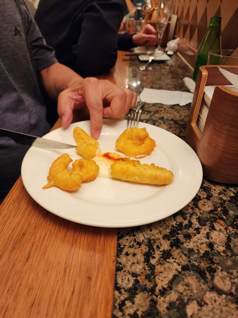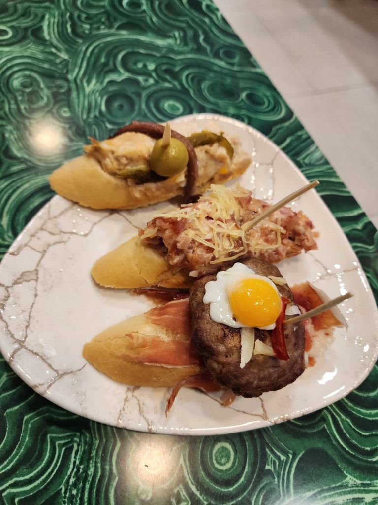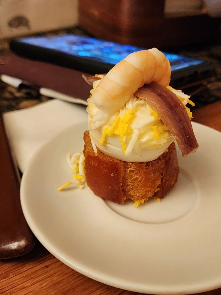Our first dinner in San Sebastián has to be of course a Michelin mention at least! And pintxos, of course! The guys are in charge of picking out dining and they are doing a fantastic job! This is last night, in the old town, at Ganbara. 13 food items between the 4 of us, wild mushrooms, crab tarts, gambas (shrimp in garlic olive oil) wonderful battered asparagus and shrimp…. it was all delicious! As much as we could eat, we were all full! With drinks, just 123€