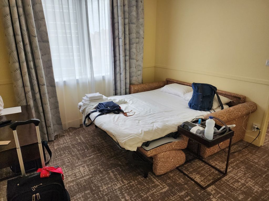 Bordeaux for a bit of French cuisine next. Our Hotel, Indigo. We have a 2 BR suite sharing with Kathy, and it actually has a wall and door between them! But the toilet is off her room and the shower is off our room!?