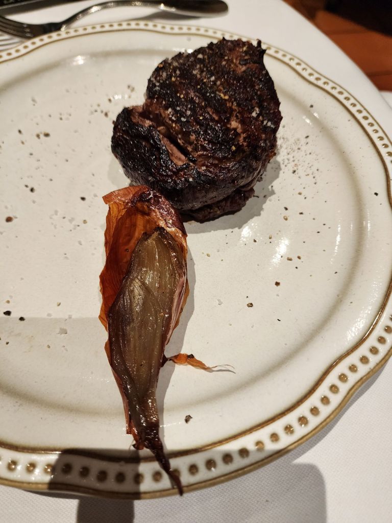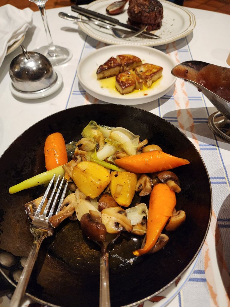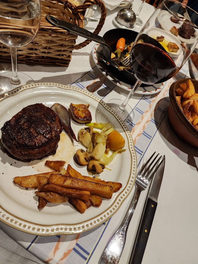 Our wonderful Classic French meal for dinner at La Tupiña. White asparagus starter, chateaubriand, with fois Gras, vegetables, REAL French fries, fried in Duck fat ( amazing) and a pasta dish. Berry ice creams and creme Brulee for dessert. Delicious