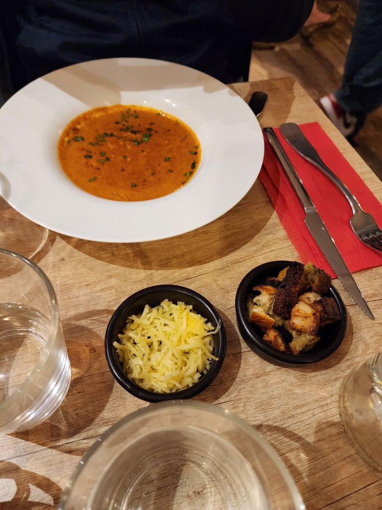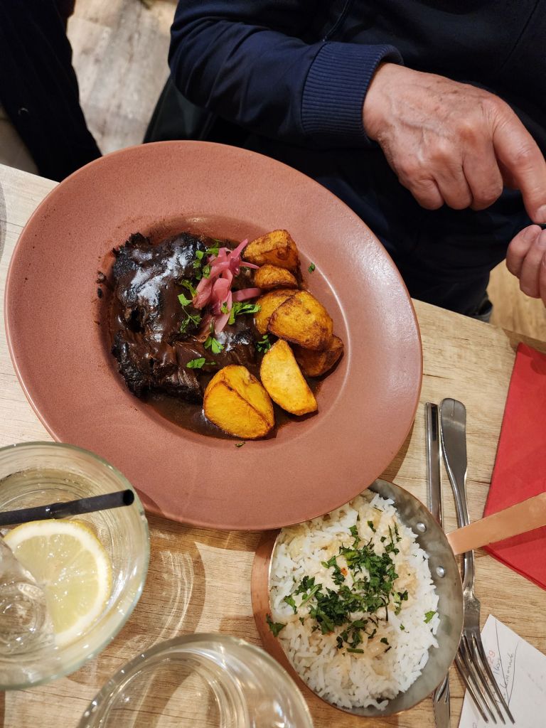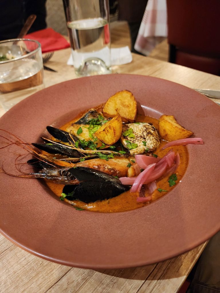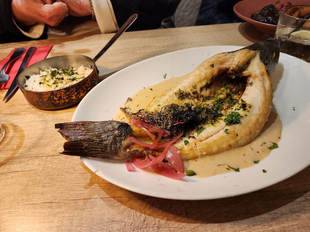 We enjoyed a lovely dinner with some new twists! Kathy and I shared the Seabass for 2, and the guys had the meal of the day, with different entrees