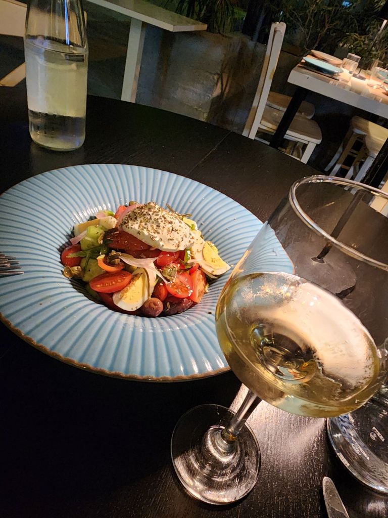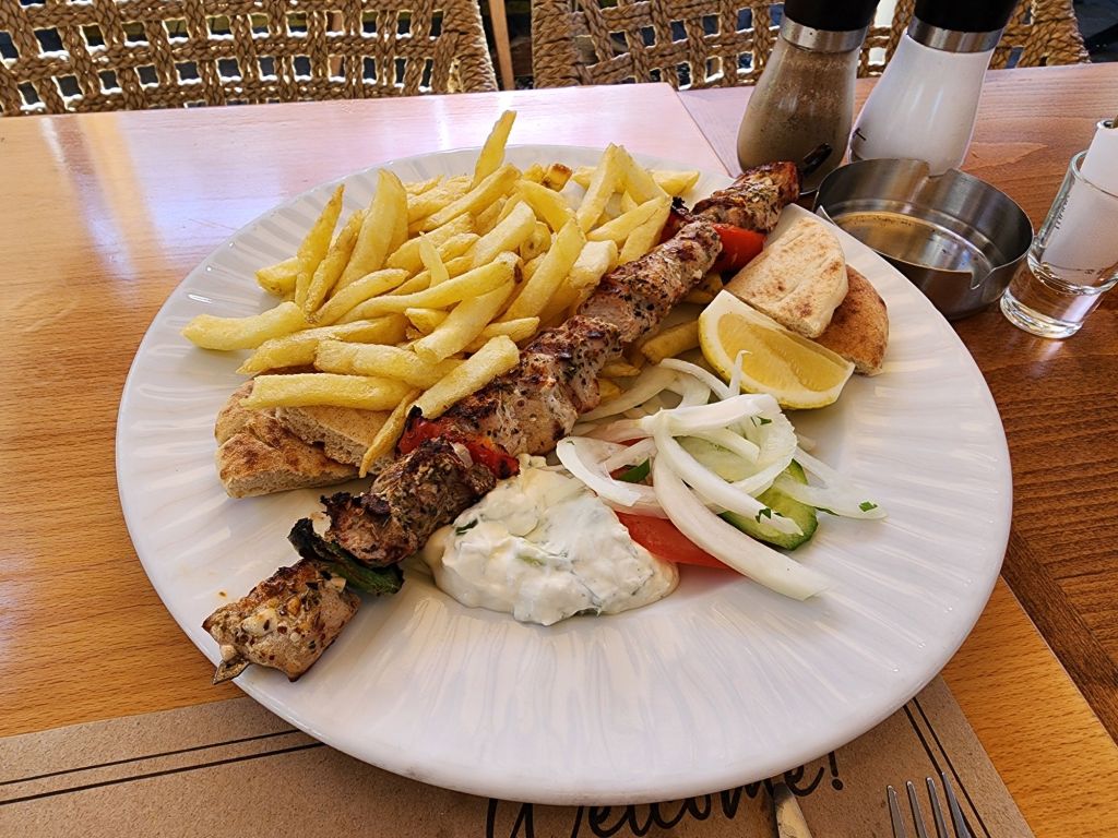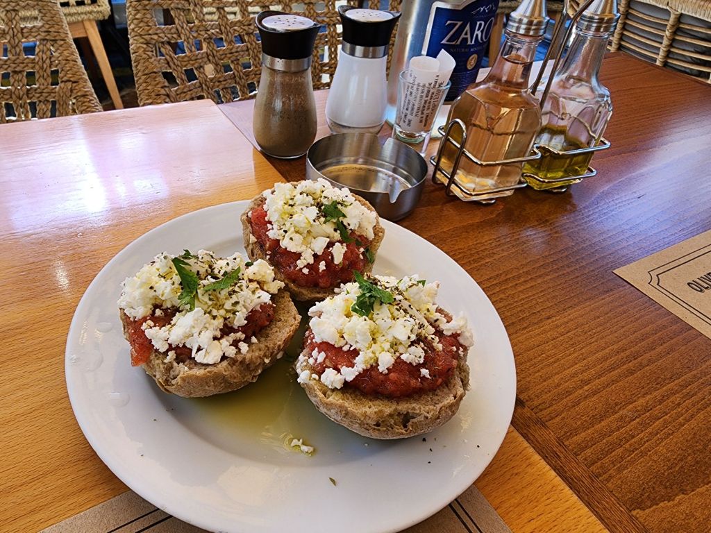 Lunch was Davos, tomato puree and feta on bread, and Pork souvlaki