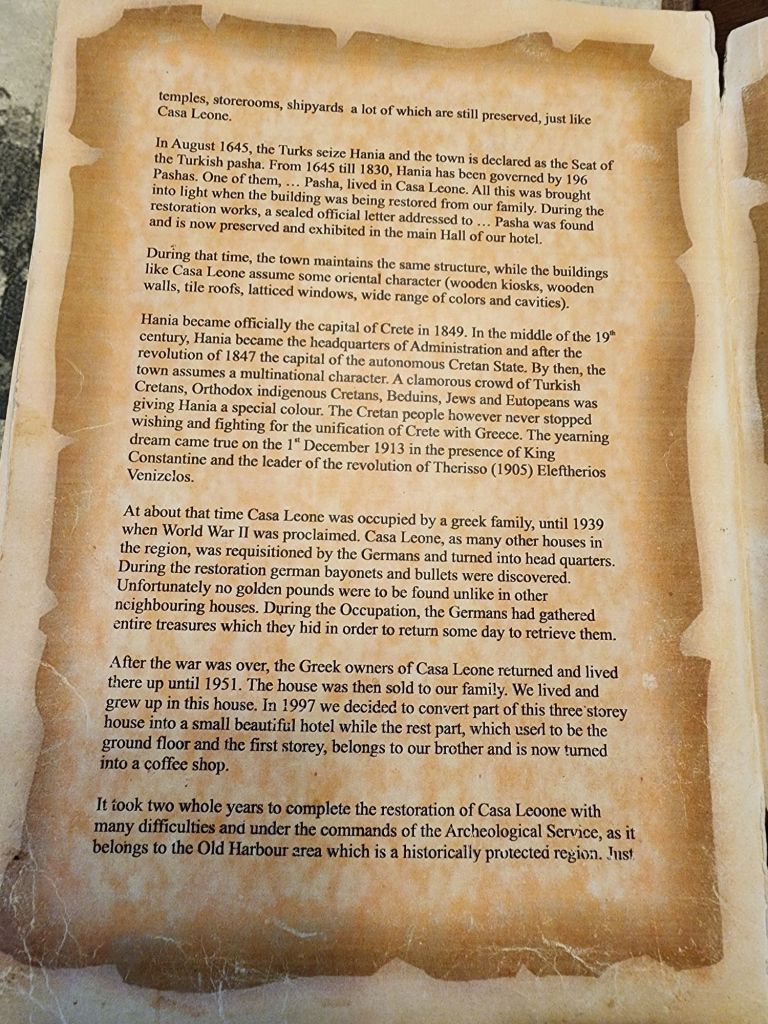 We have arrived for 3 days here on the ancient Venetian harbor of Chania. We are in a hotel for these 3 days, in a quiet space on the harbor. The Casa Leone. This house dates to the 15th century and had an amazing history, even used as a Nazi HQ during their occupation.