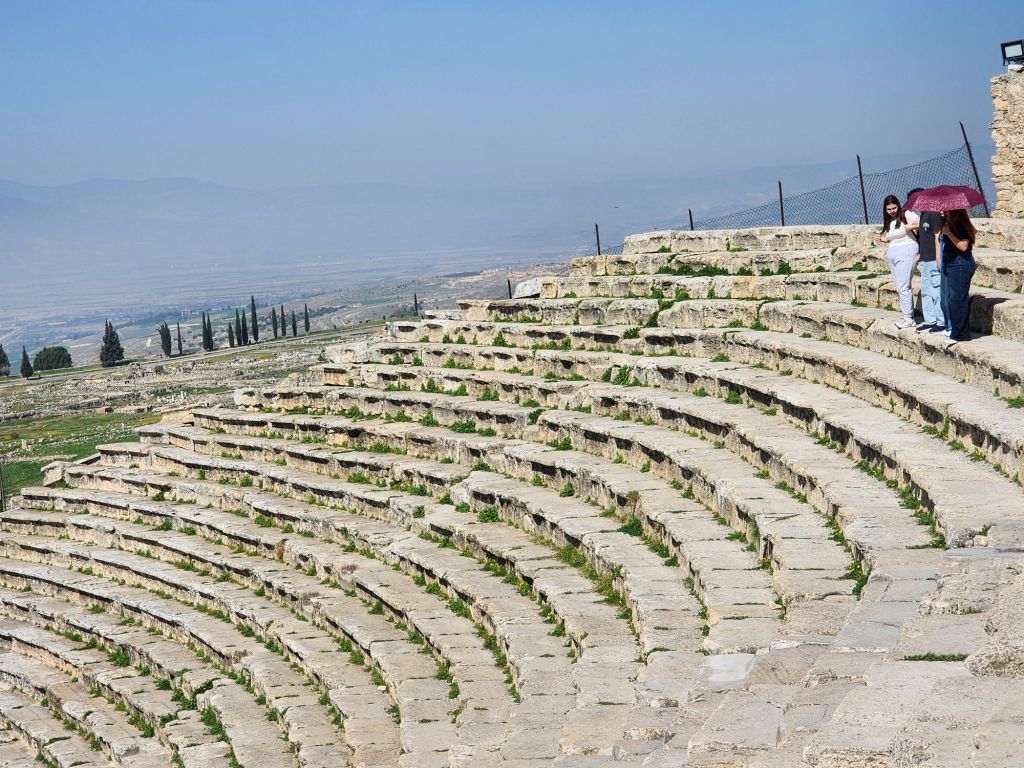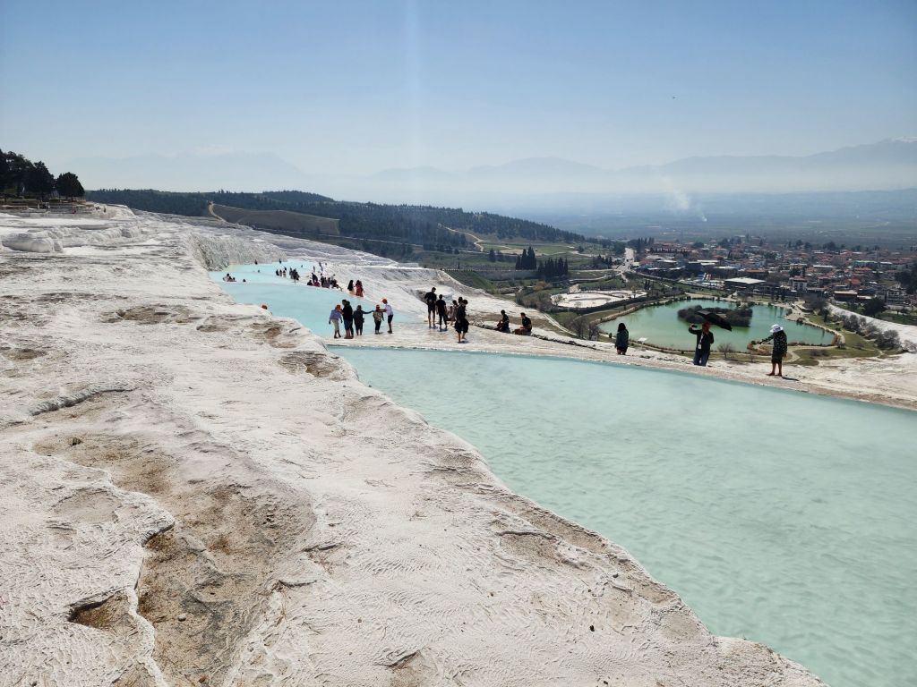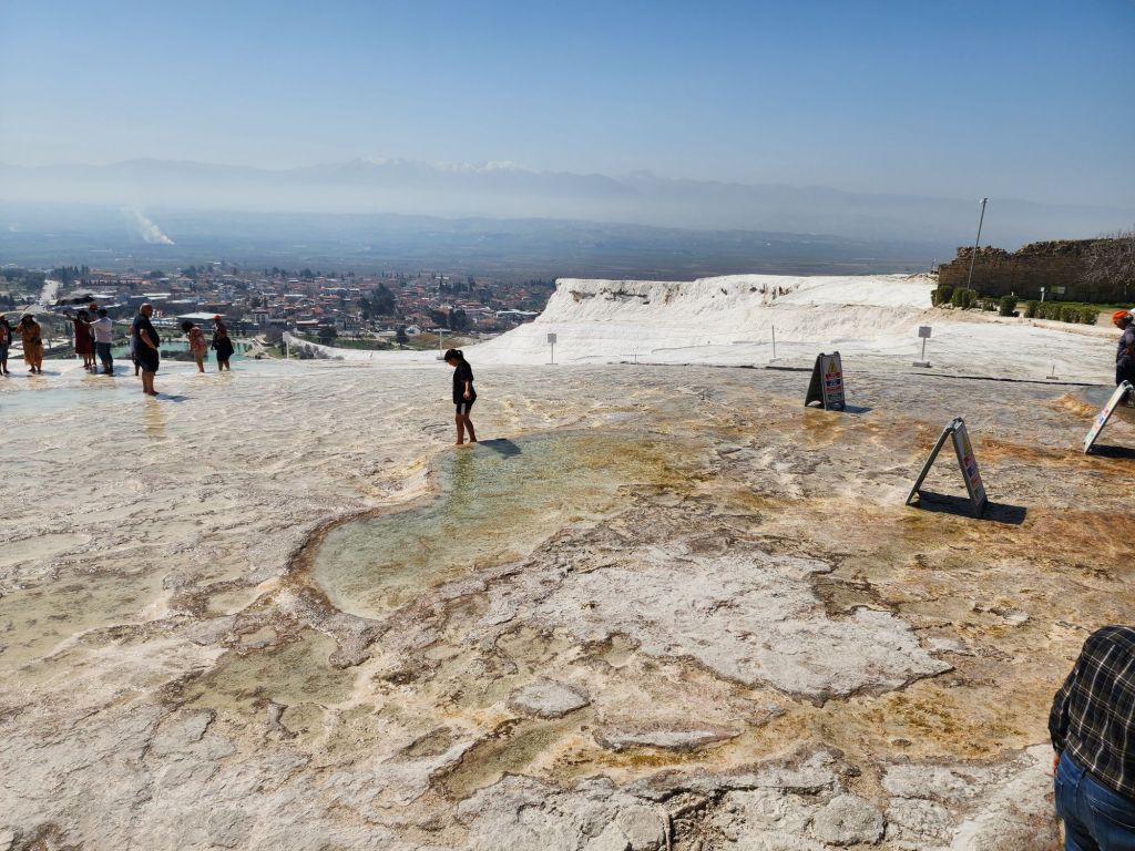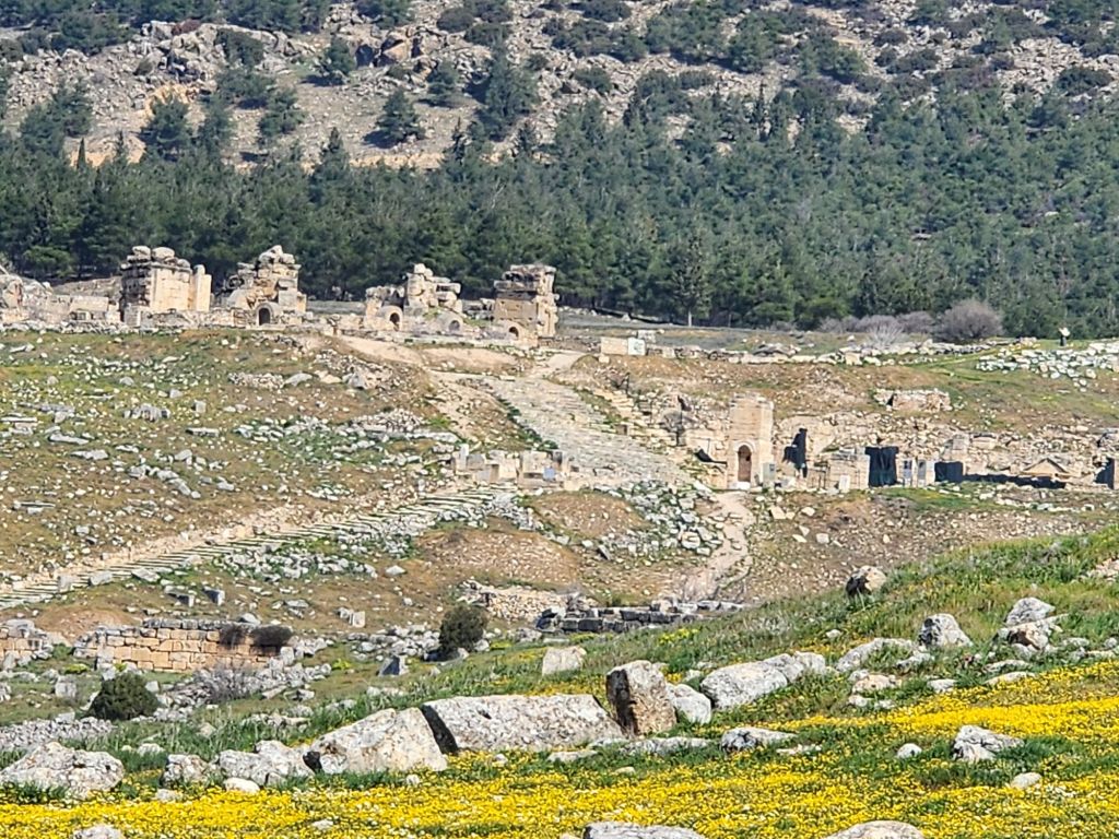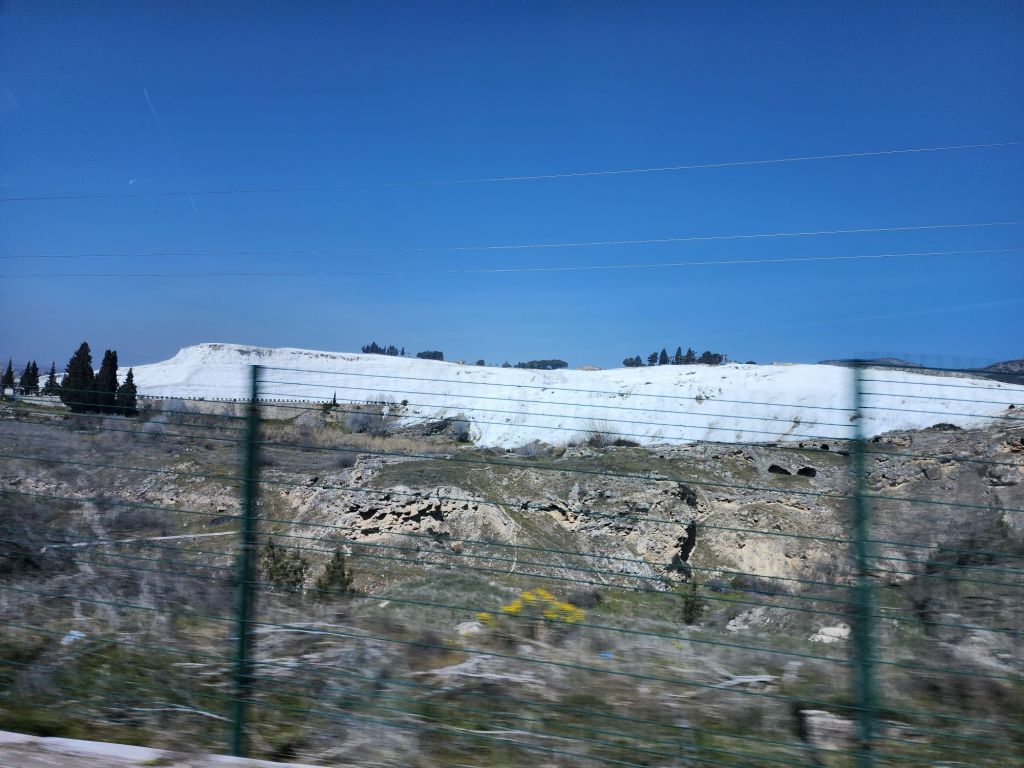 It is a not if a drive, 3 hours east from Kusadasi, where we are starting 2 nights, to the area of the white castle mountain, Pamukkale with the Roman city Hieropolis on its summit. The calcium rich spring has covered the mountain side for, they say, 12 million years.