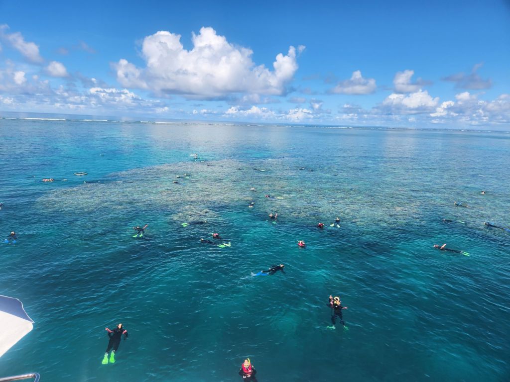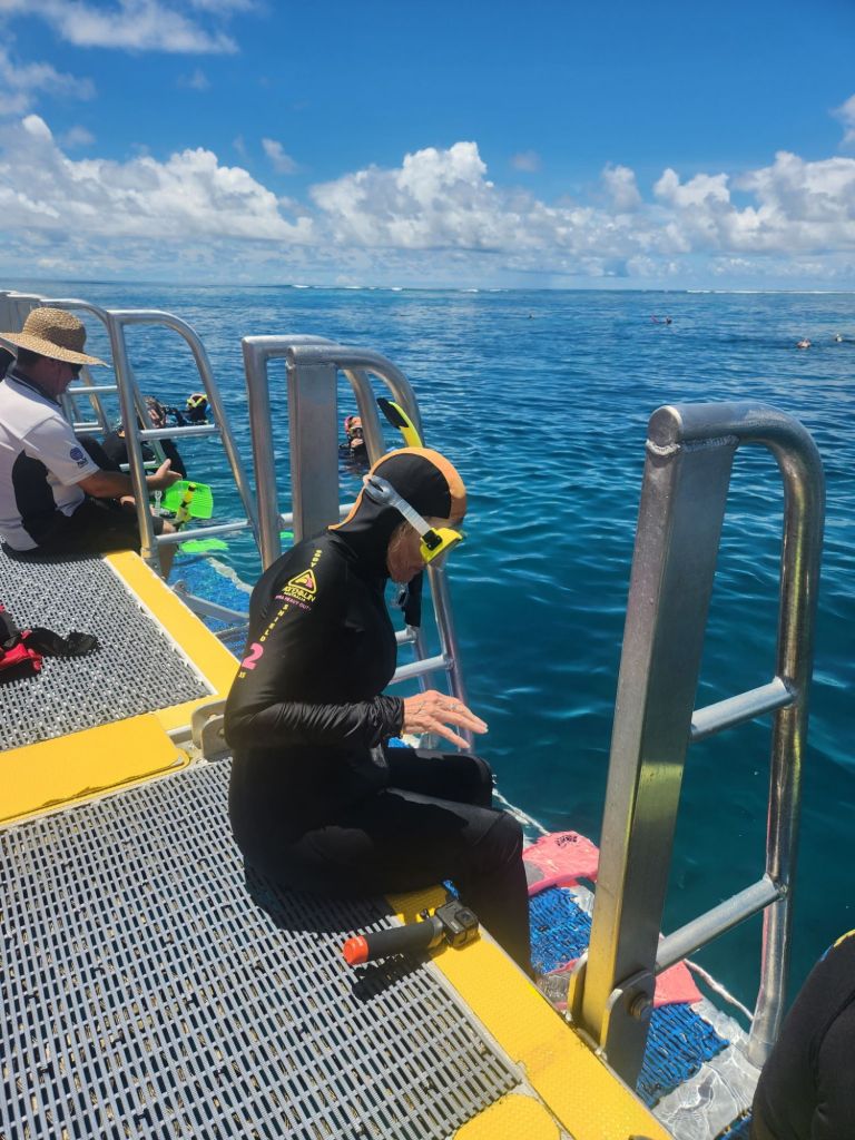 We were able to get into the water and view the underwater life at least 2 or 3 times over the next 3.5 hours, in between, enjoying lunch on board. Unfortunately, all the photos and video of that gorgeous reef will have to wait! The SD card in my GoPro decided to crash! Hopefully our wonderful computer whiz Craig Muranaka can rescue them when we get home and I will make a video show for you all then! In the meantime, here is a preview from above water.