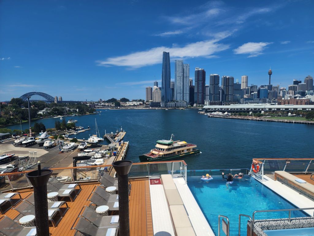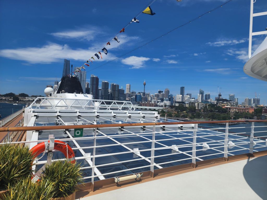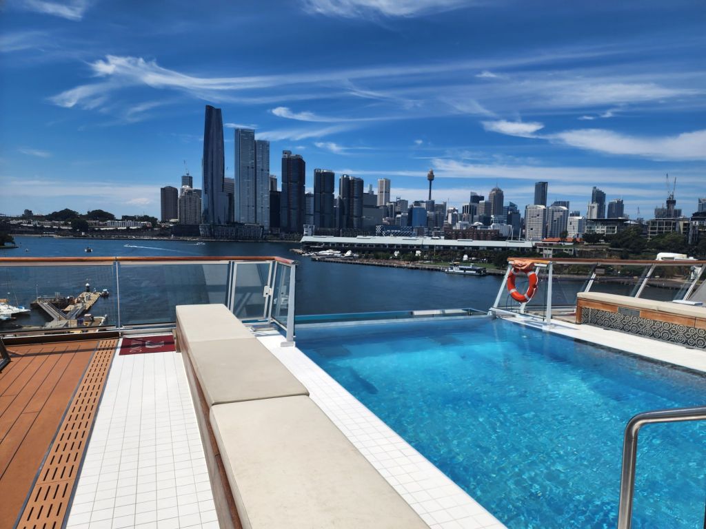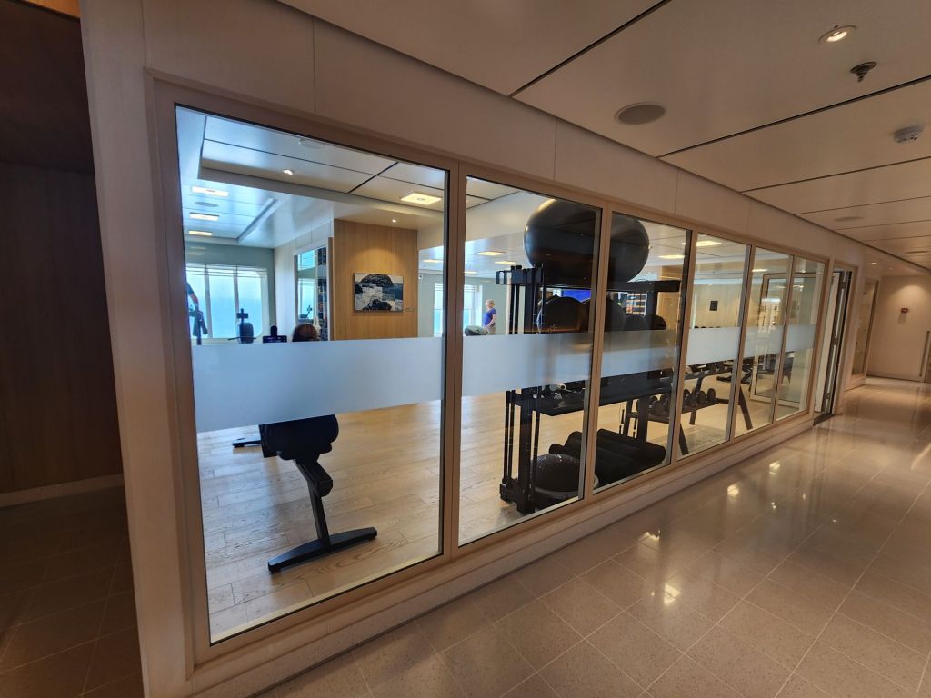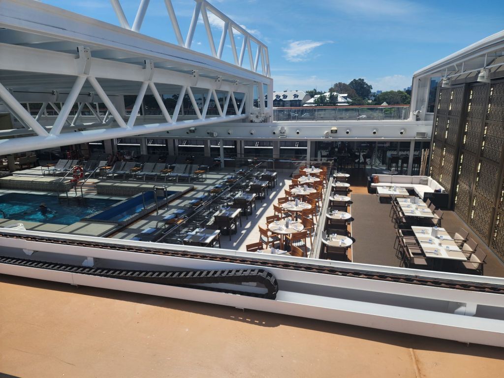 You can walk all around the ship on decks 8 and 2. As you walk around the 8th deck you can look down into the pool, which can close it’s ceiling on bad days