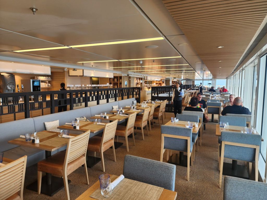 The Restaurant on Deck 2, where no reservation is needed, open for breakfast, lunch on seas days, as well as dinner every night.