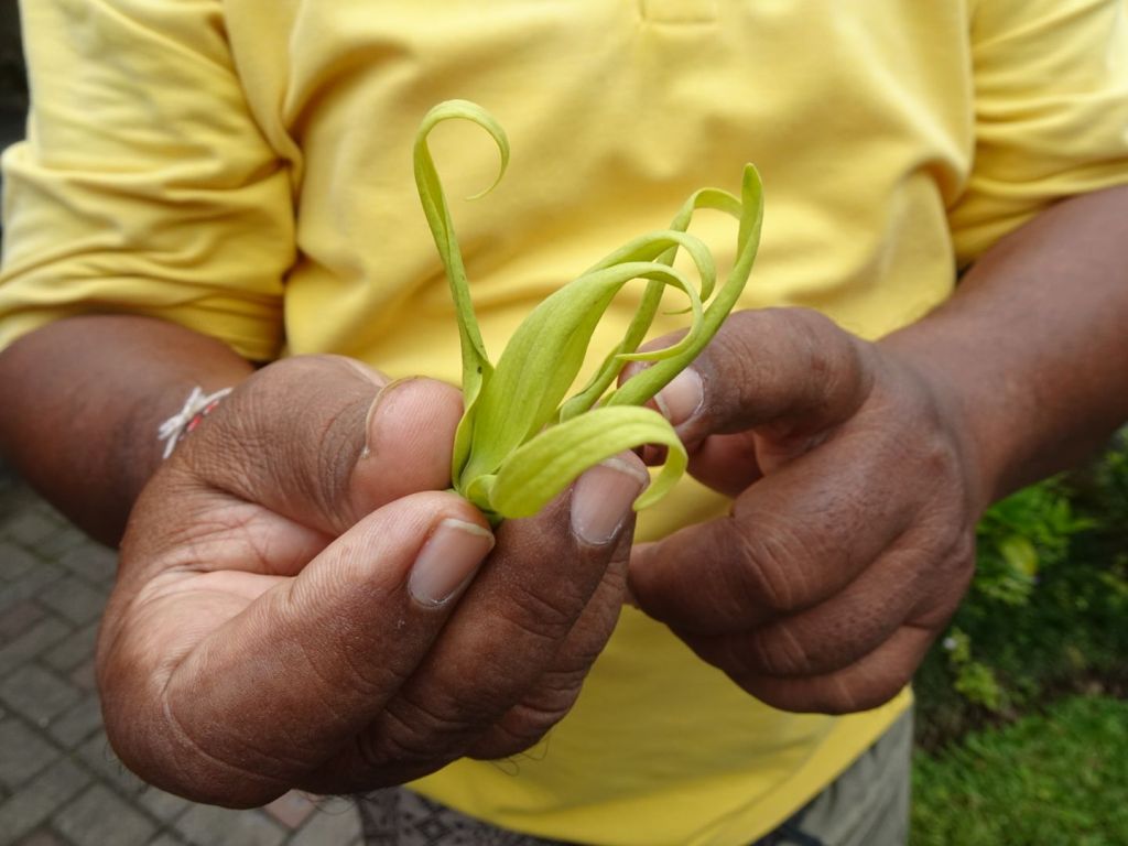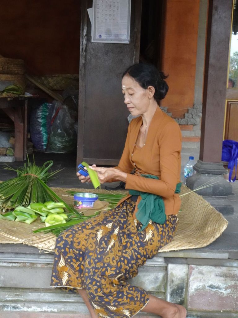 This lady is weaving the small reed bowl for the offerings the five to the gods, filled with flowers, fruit, and sometimes a cracker