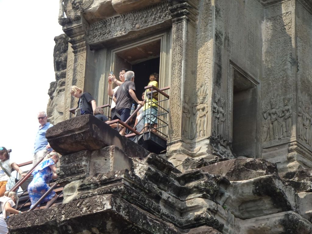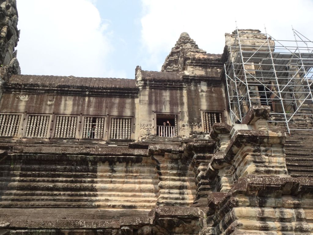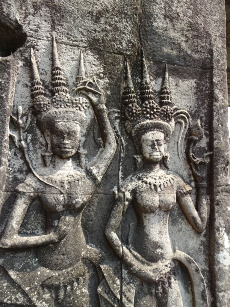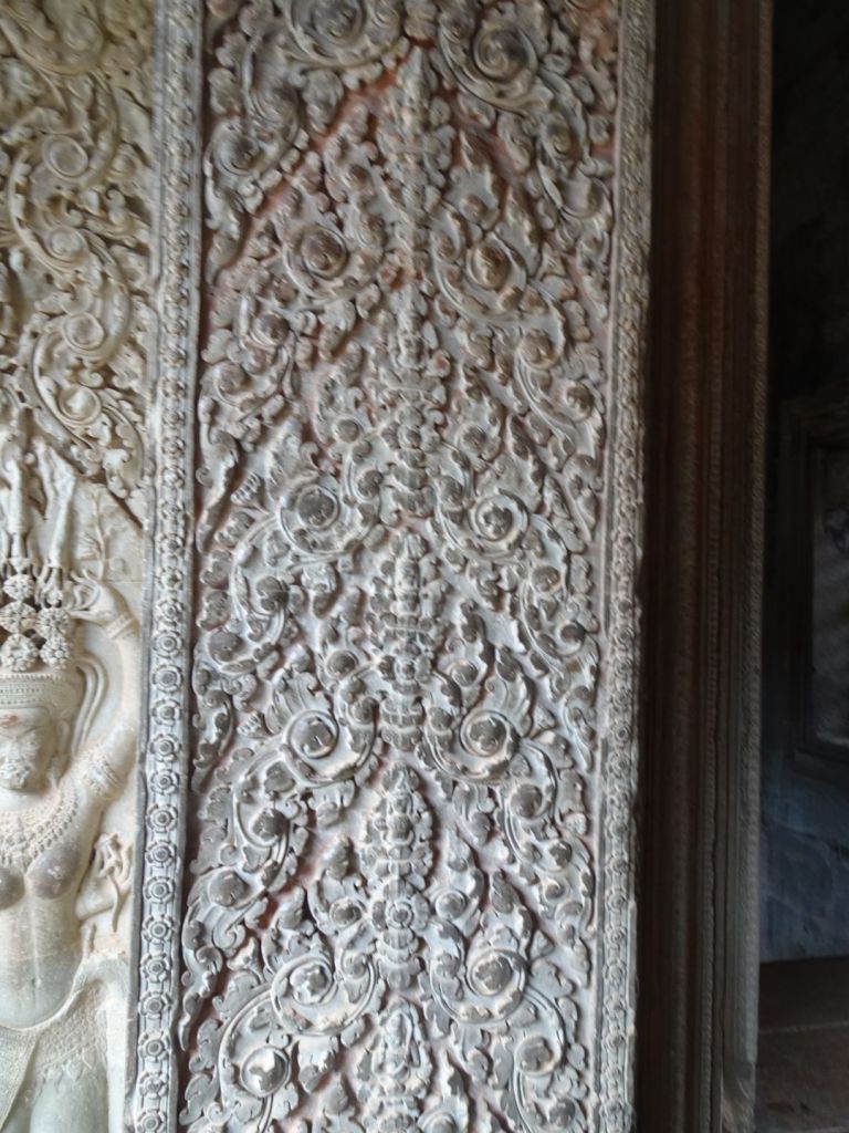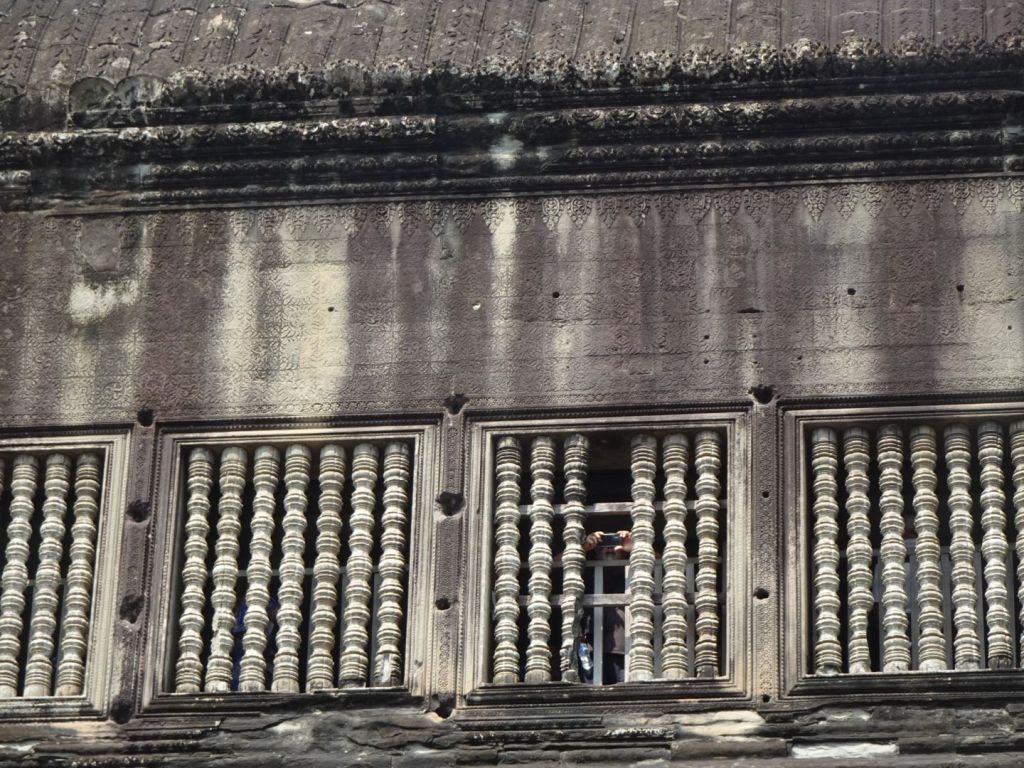 The carvings and designs on the walls were impressive and some quite unique. The ballistrades are not smooth, and the design allows breezes to swirl inside the building. They are specifically designed also to cast shadows in the early light of the silhouette of the Angkor’s towers, one, three and five towers. Amazing. our guide showed us pictures of these shadows as the sun was already too high for us too see them.