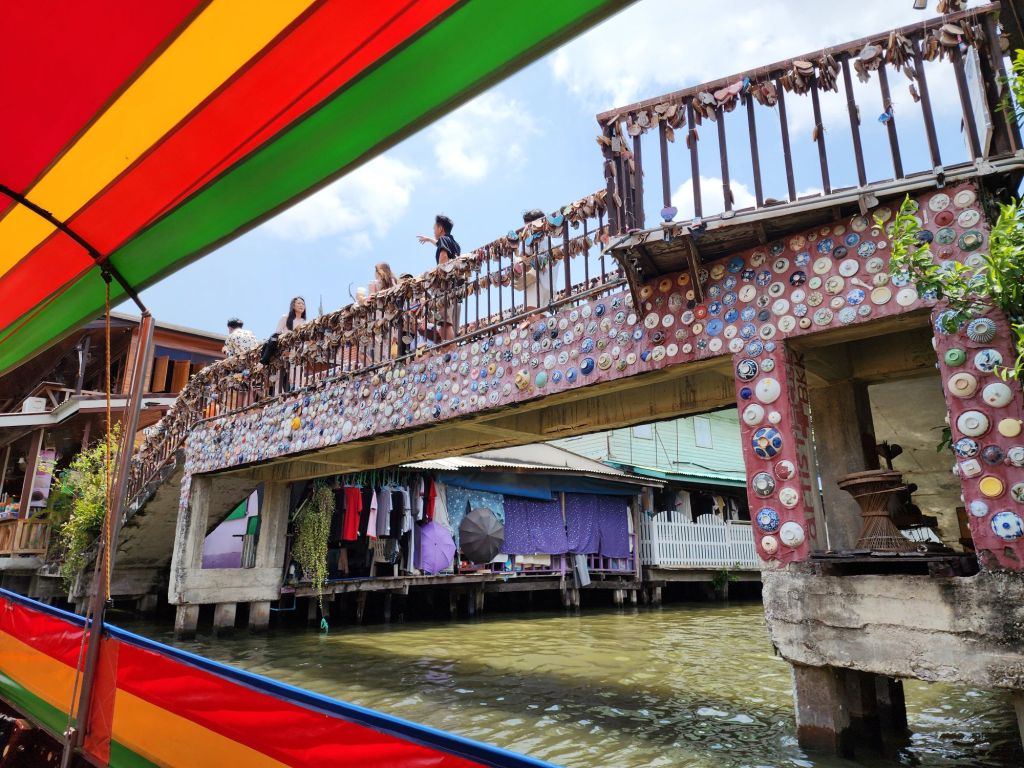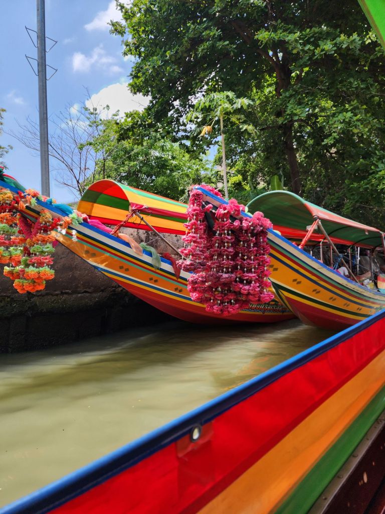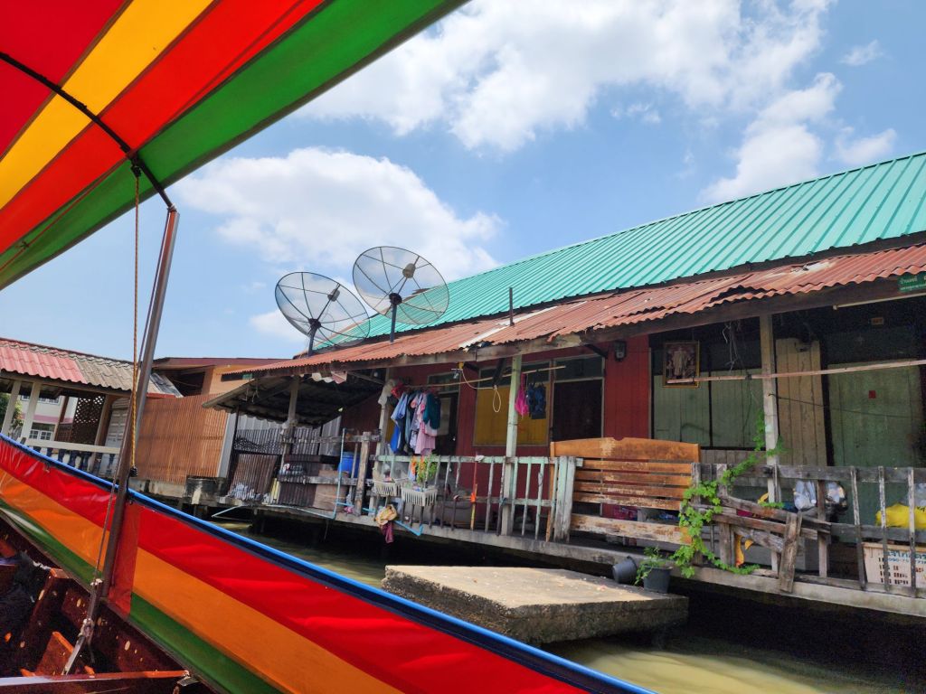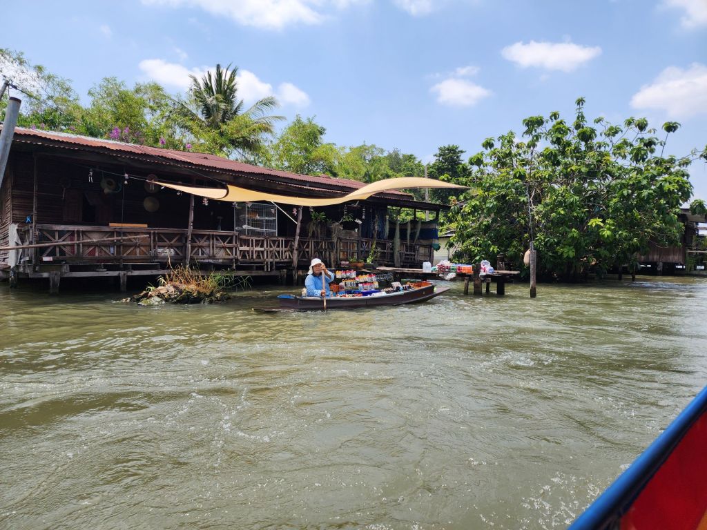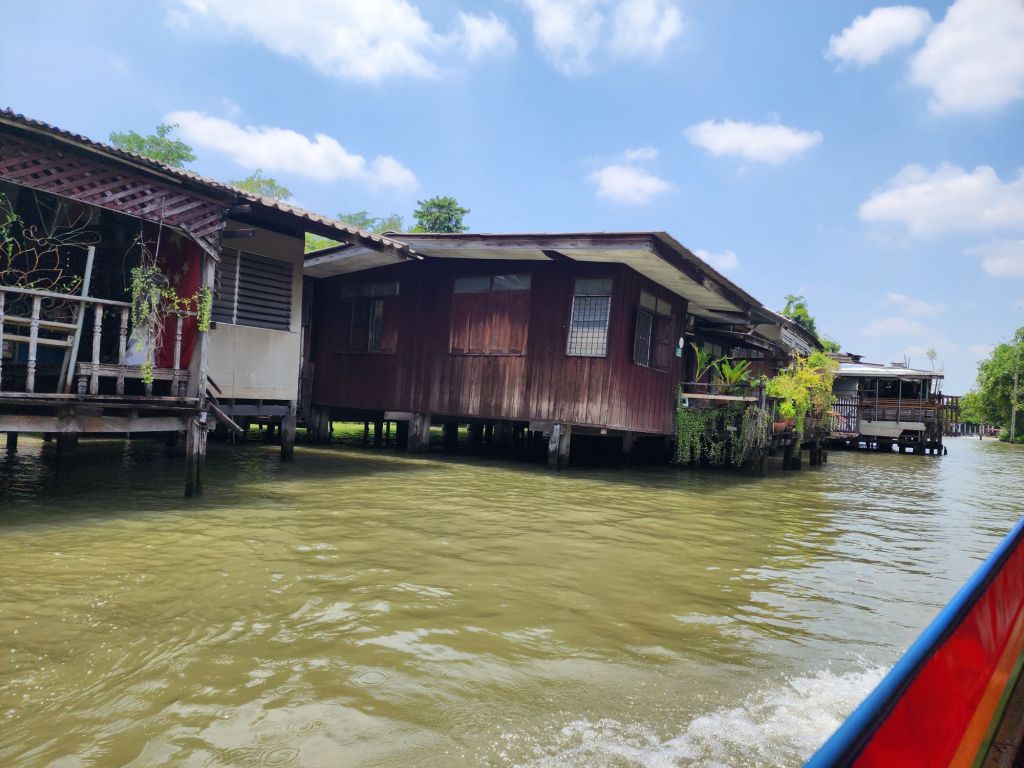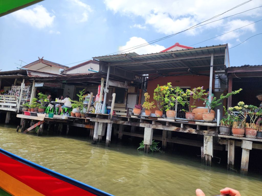 After our visit to the Royal Palace, we took the “ferry”, a long tail boat, across the river and through some of the canals on the other side of the River. Along these canals are many private homes, some communities of families who have lived there 200 years. We passed many wat, or temples also.