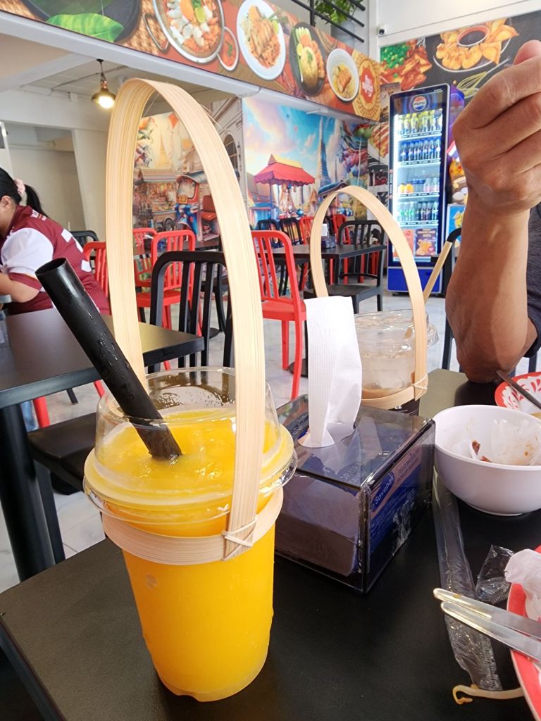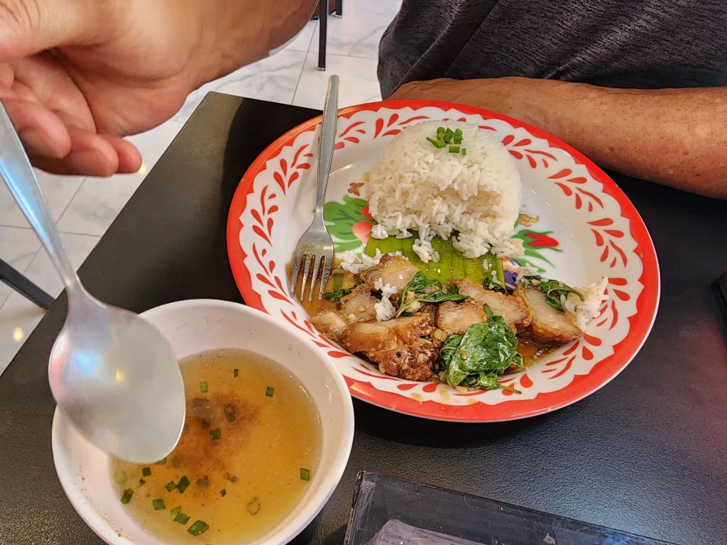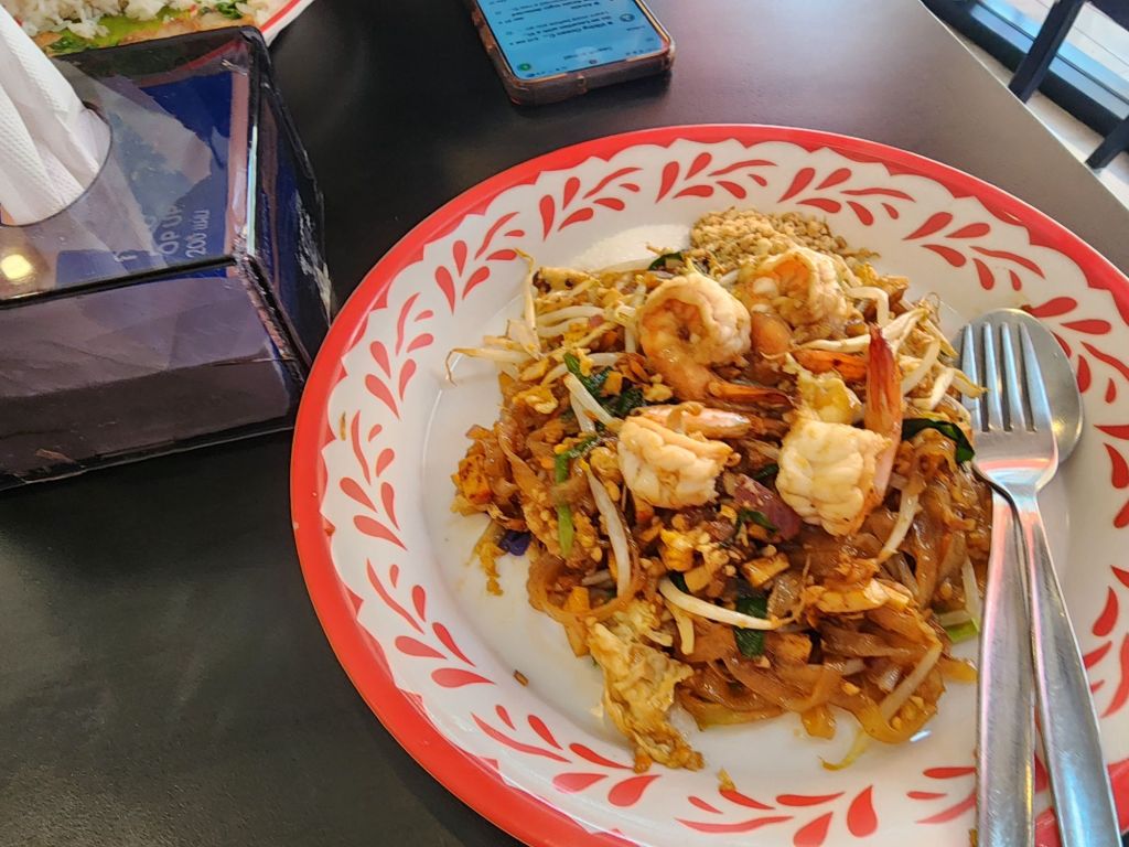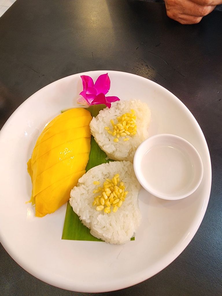 We had a lunch stop for Pad Thai. a pork dish, and Mango sticky rice, my favorite dessert. with mango smoothie and iced coffee. The temperature got up to 95° F , so the AC and cool dessert were refreshing