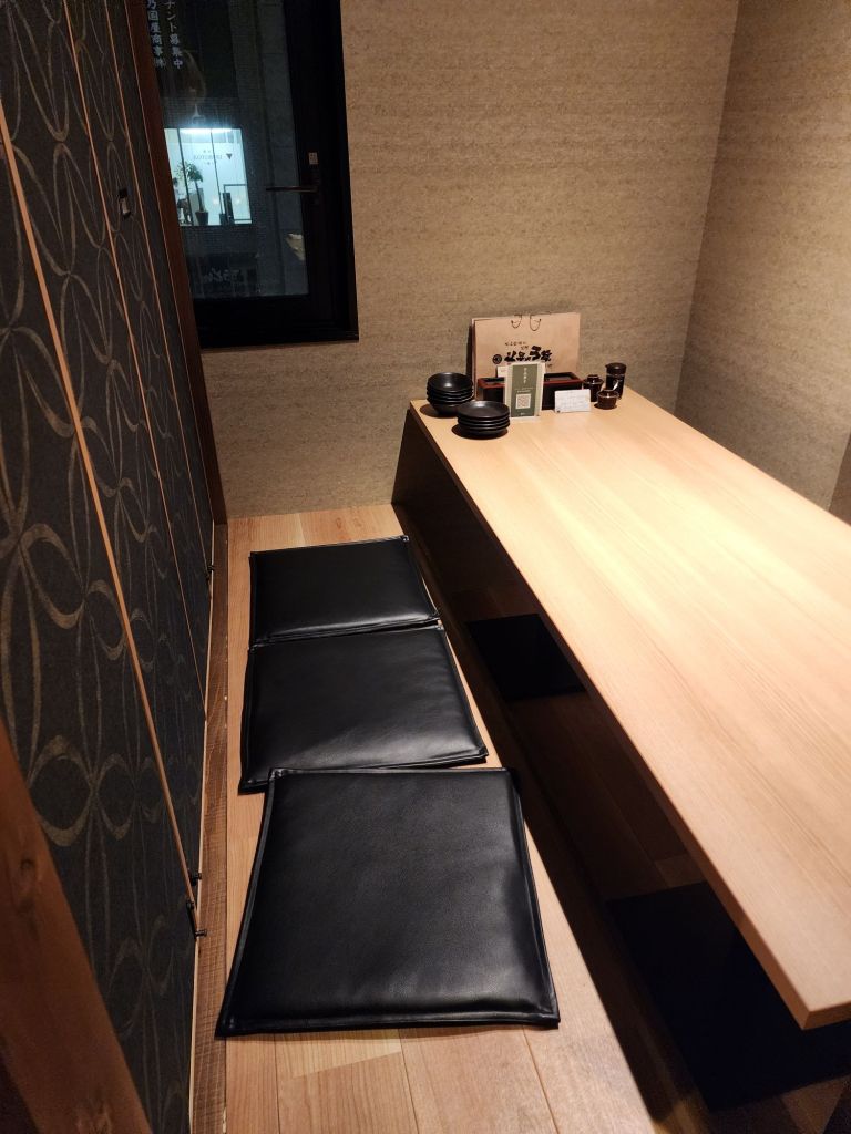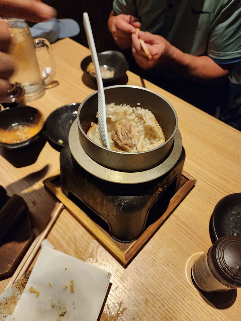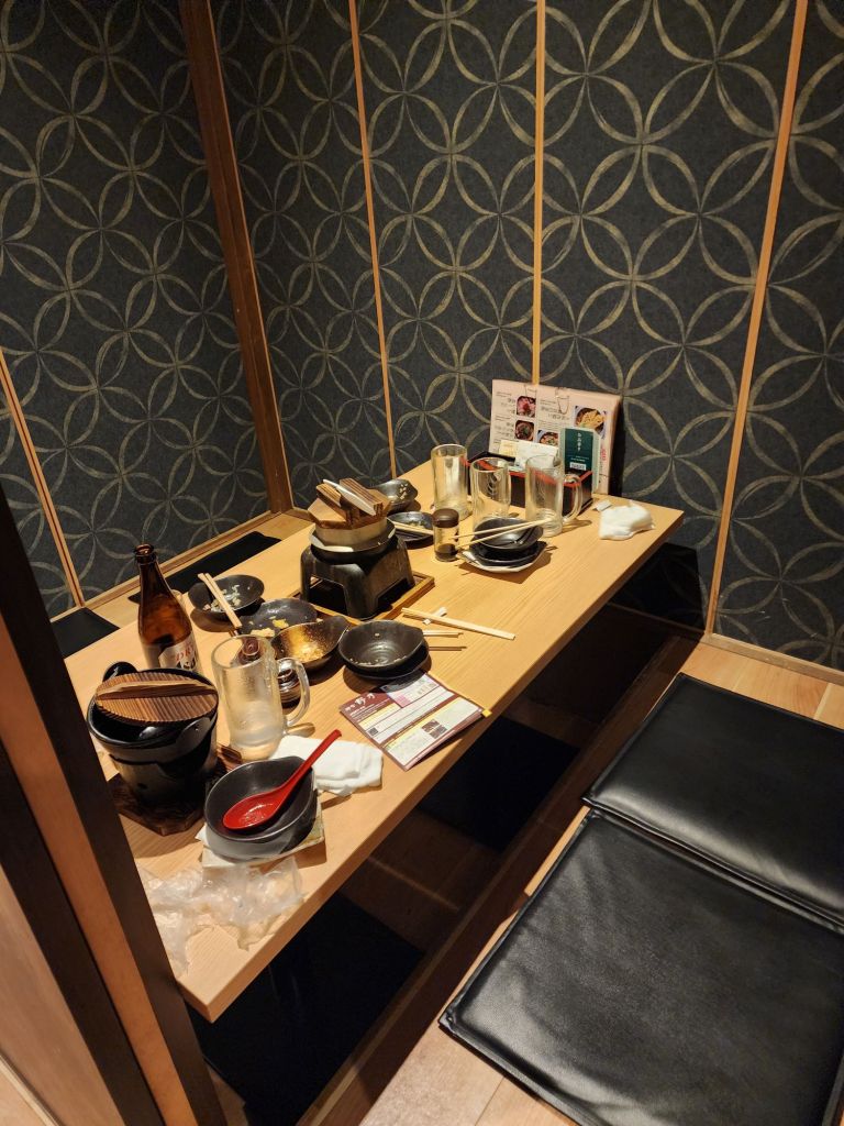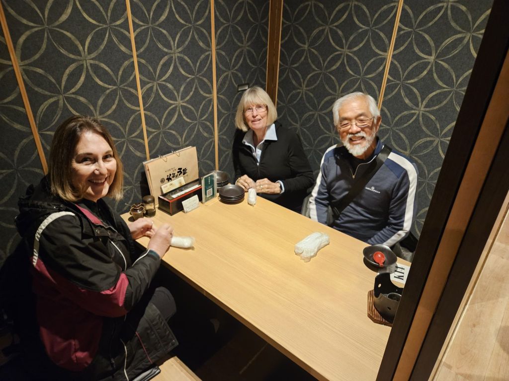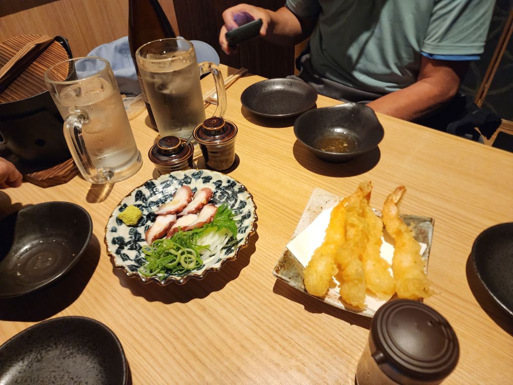 Our dinner restaurant had the tables separate in tatami-like room, with awell under the table for our legs. We didn’t need to sit crossed legged, thank goodness. We ordered several tempura dishes, edemame, and a rice dish all to share.
