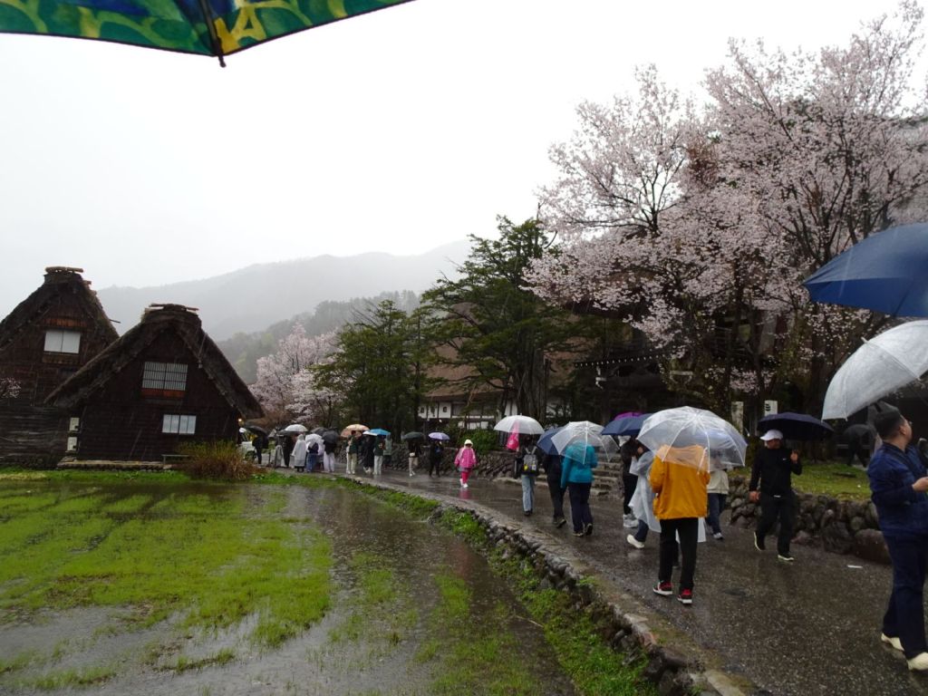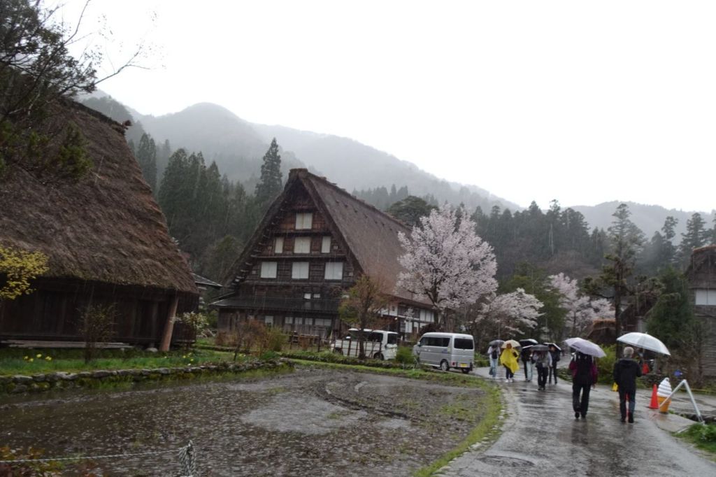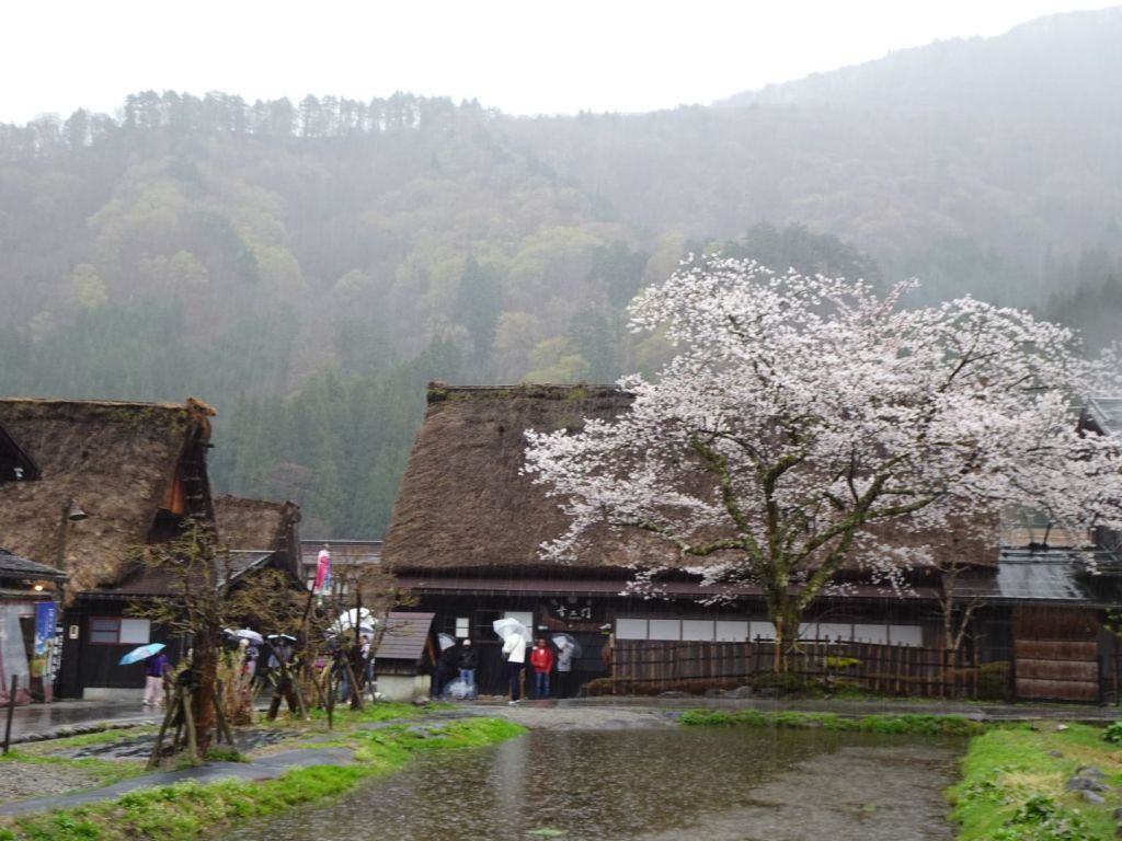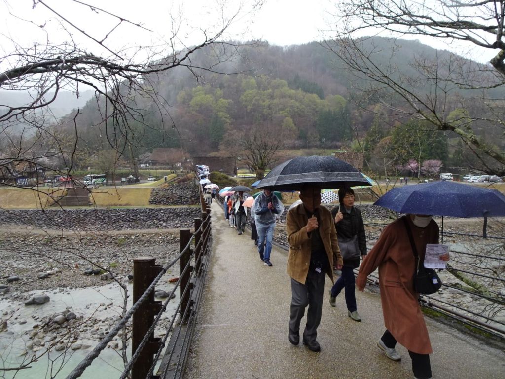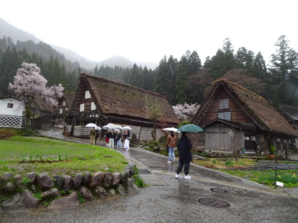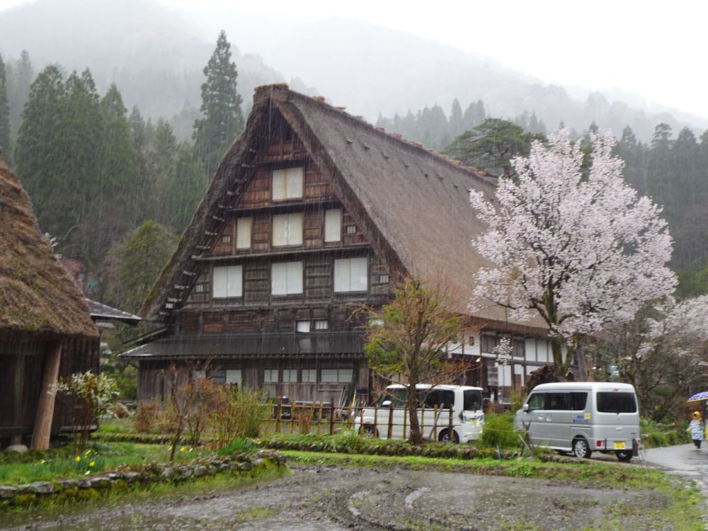 We had planned our first full day in Kanazawa to visit an ancient village in the mountains called Shirakawa-go and a tour of the the beautiful park in Kanazawa. We met our guide and bus at the train station for the hour drive to Shirakawa-go. It was a very rainy day, but that does not stop anything in Japan.
