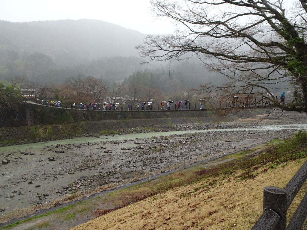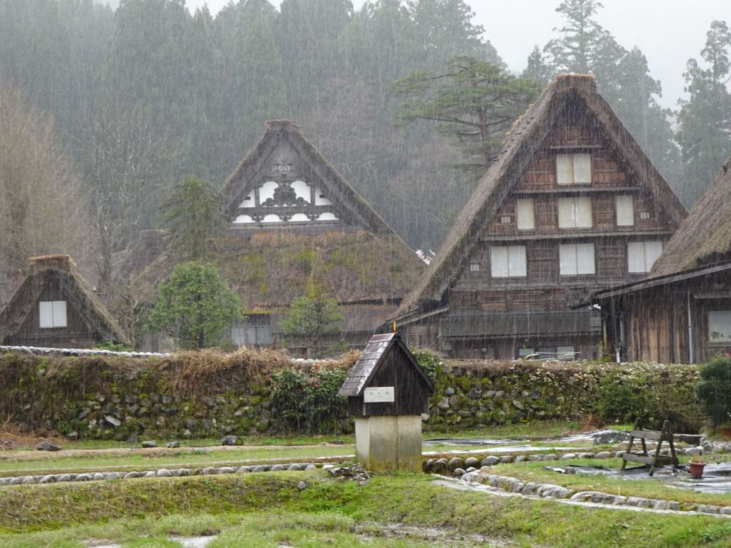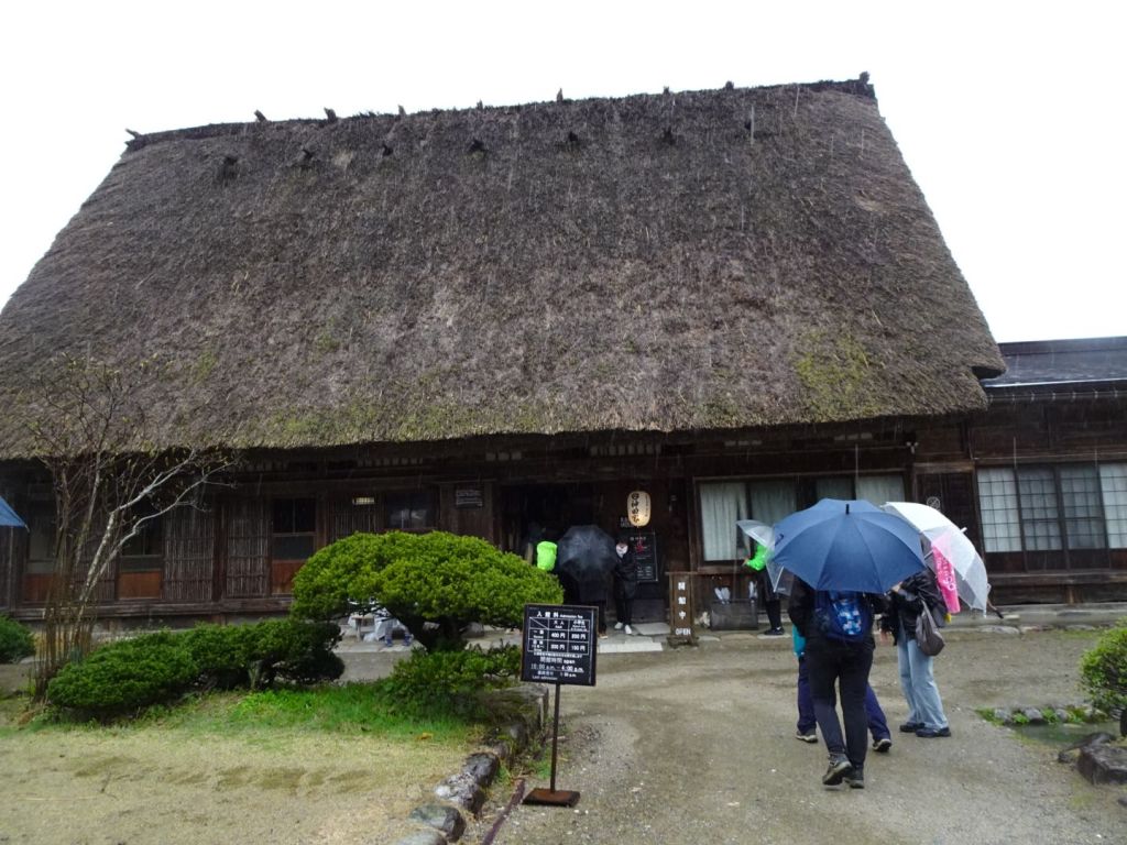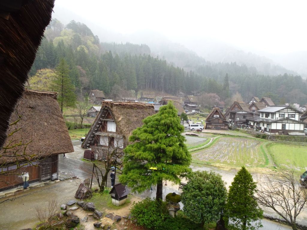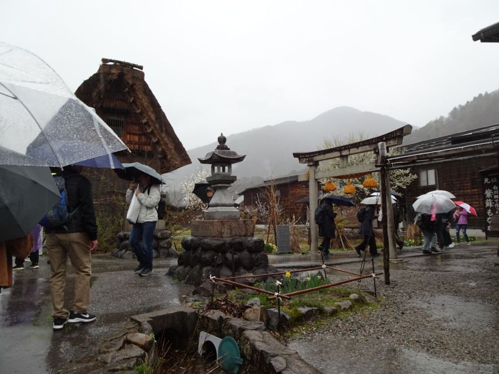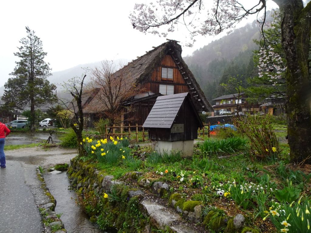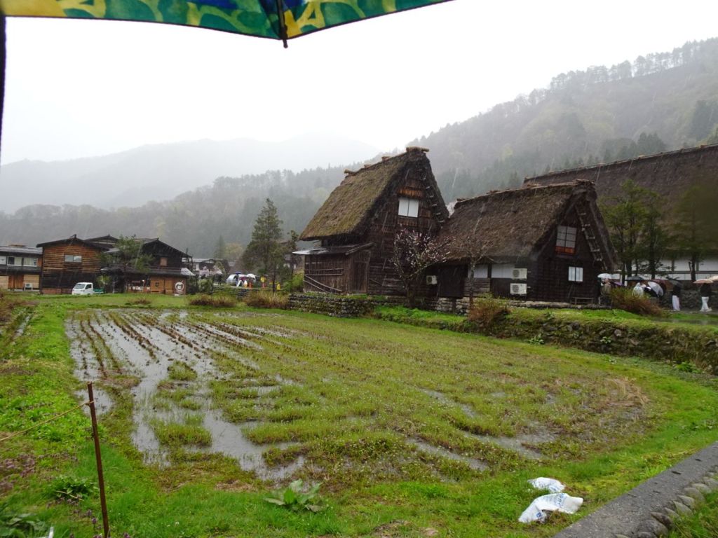 We had planned our first full day in Kanazawa to visit an ancient village in the mountains called Shirakawa-go and a tour of the the beautiful park in Kanazawa. We met our guide and bus at the train station for the hour drive to Shirakawa-go. It was a very rainy day, but that does not stop anything in Japan.